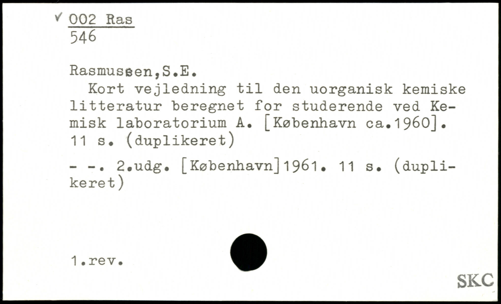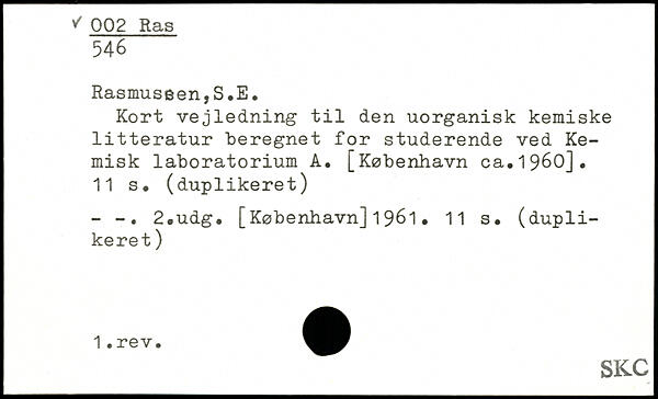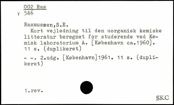 Kort vejledning til den uorganisk kemiske litteratur beregnet for studerende ved Kemisk laboratorium A. [København ca.1960]