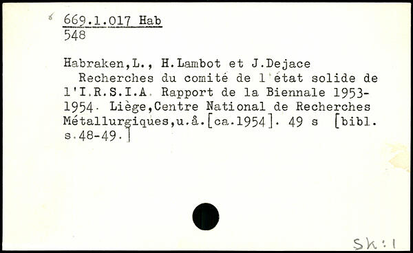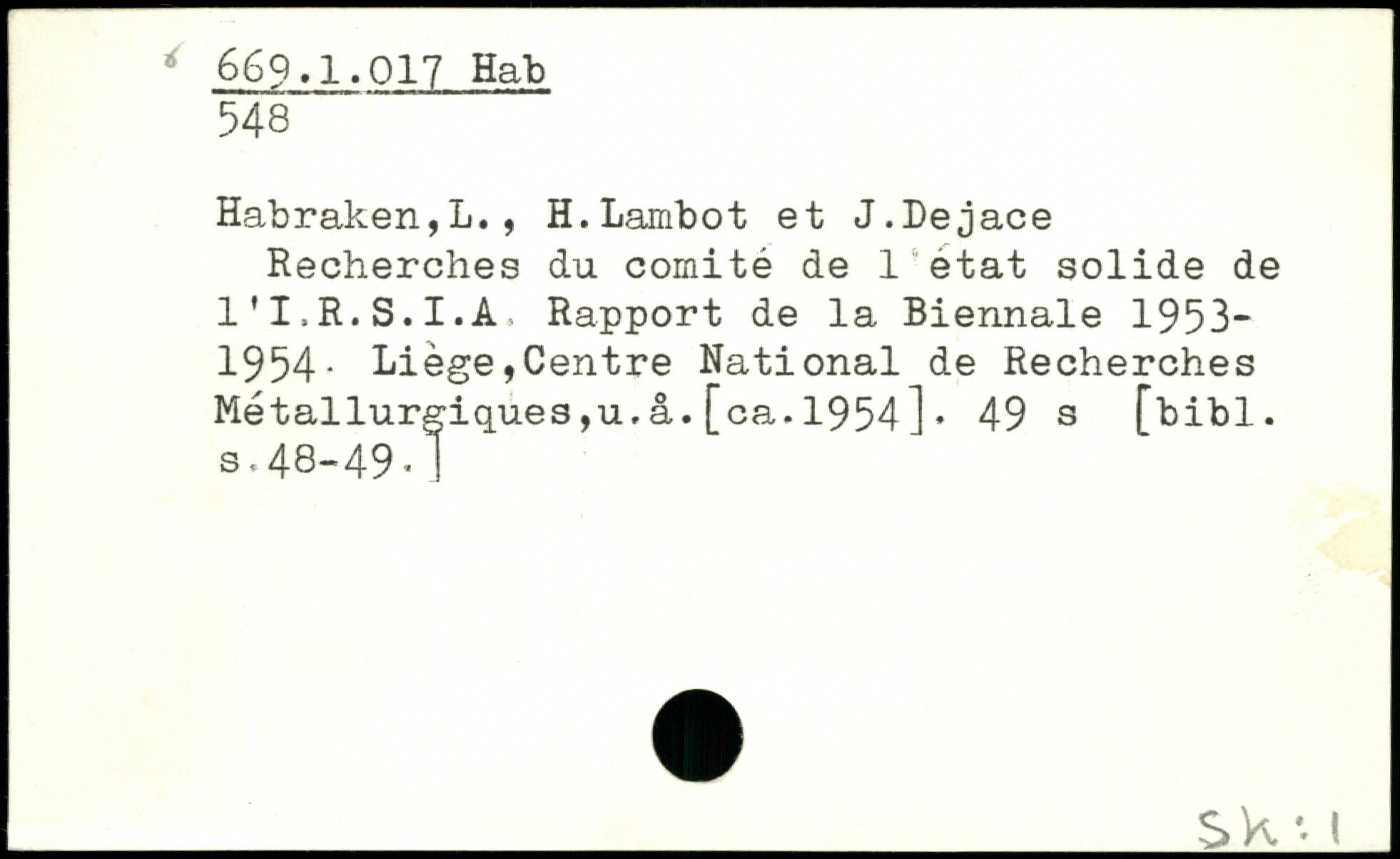 Recherches du comité de l'état solide de l’I.R.S.I.A, Rapport de la Biennale 1953-1954. Liège,Centre National de Recherches Métallurgiques,u.â.[ca. 1954].