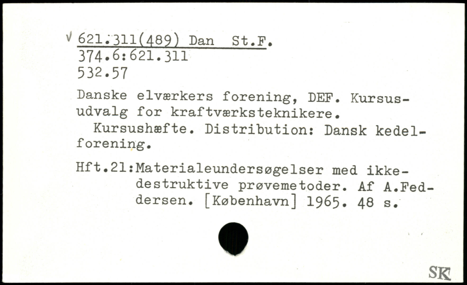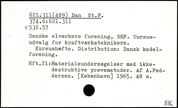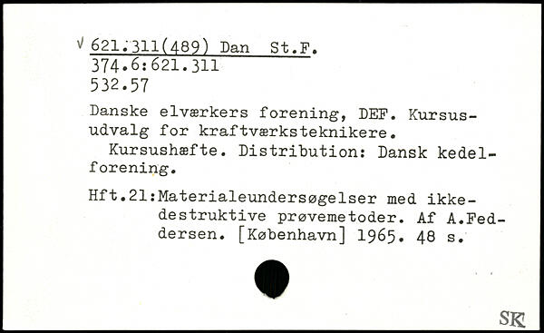 Danske elværkers forening, DEF. Kursus-udvalg for kraftværksteknikere. Kursushæfte. Distribution: Dansk kedel-forening. Hft.21:Materialeundersøgelser med ikke- destruktive prøvemetoder. Af A.Fed-dersen.