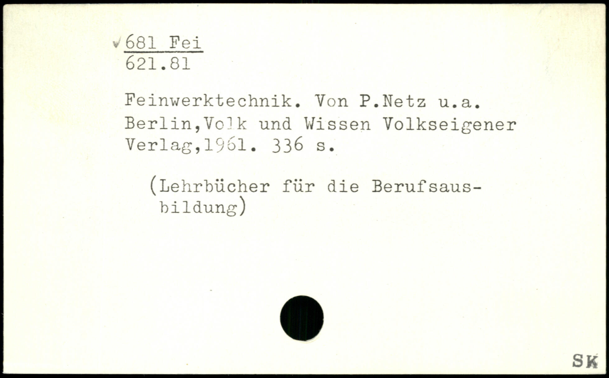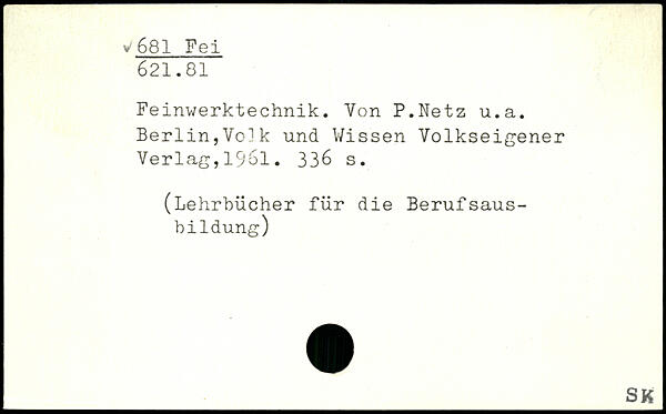 Feinwerktechnik. Yon P.Netz u.a. Berlin,Volk und Wissen Volkseigener Verlag,1961.