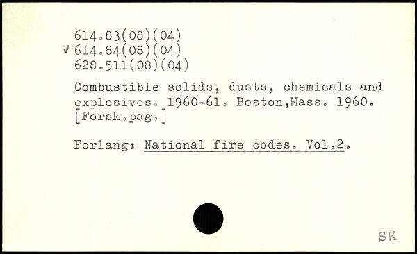 Combustible solids, dusts, chemicals and explosiveso 1960~6lo Boston,Mass,, 1960. [Forsk opag,] Forlang: National fire codes, Vol,2
