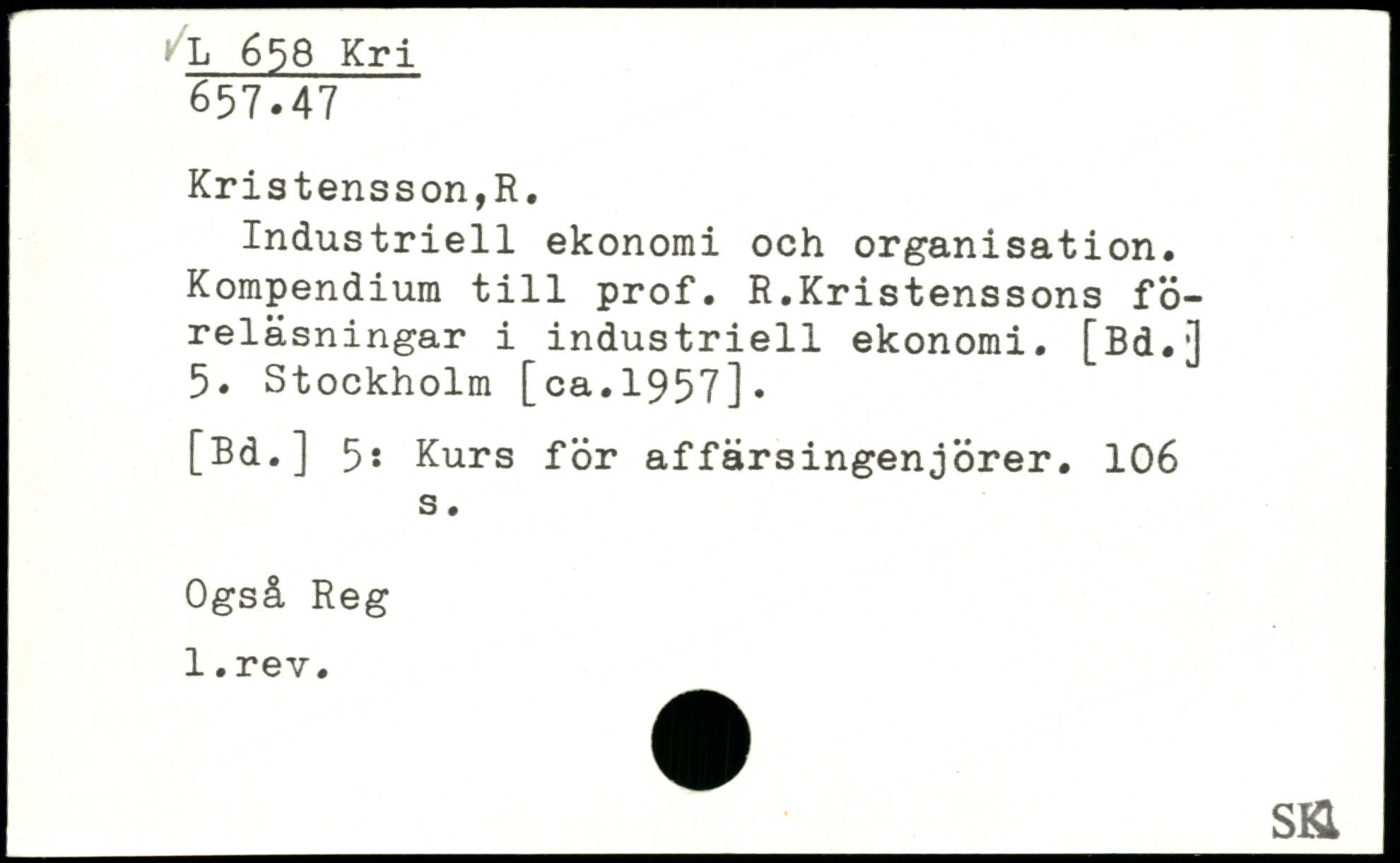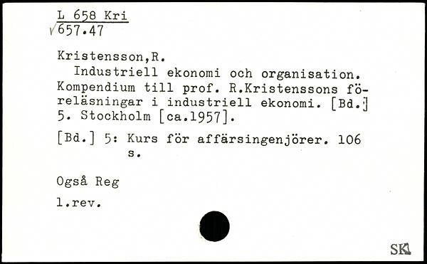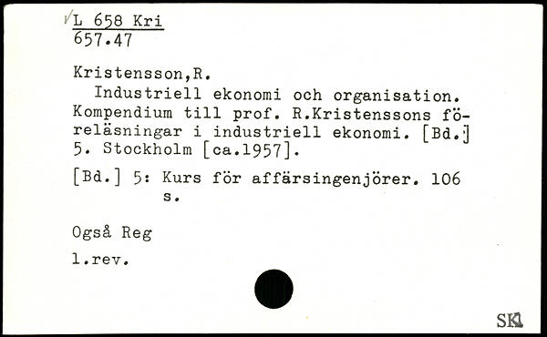 Industriell ekonomi och organisation. Kompendium till prof. R.Kristenssons föreläsningar i industriell ekonomi. [Bd.] 5. Stockholm [ca.1957]. [Bd.] 5. Kurs för affärsingenjörer.