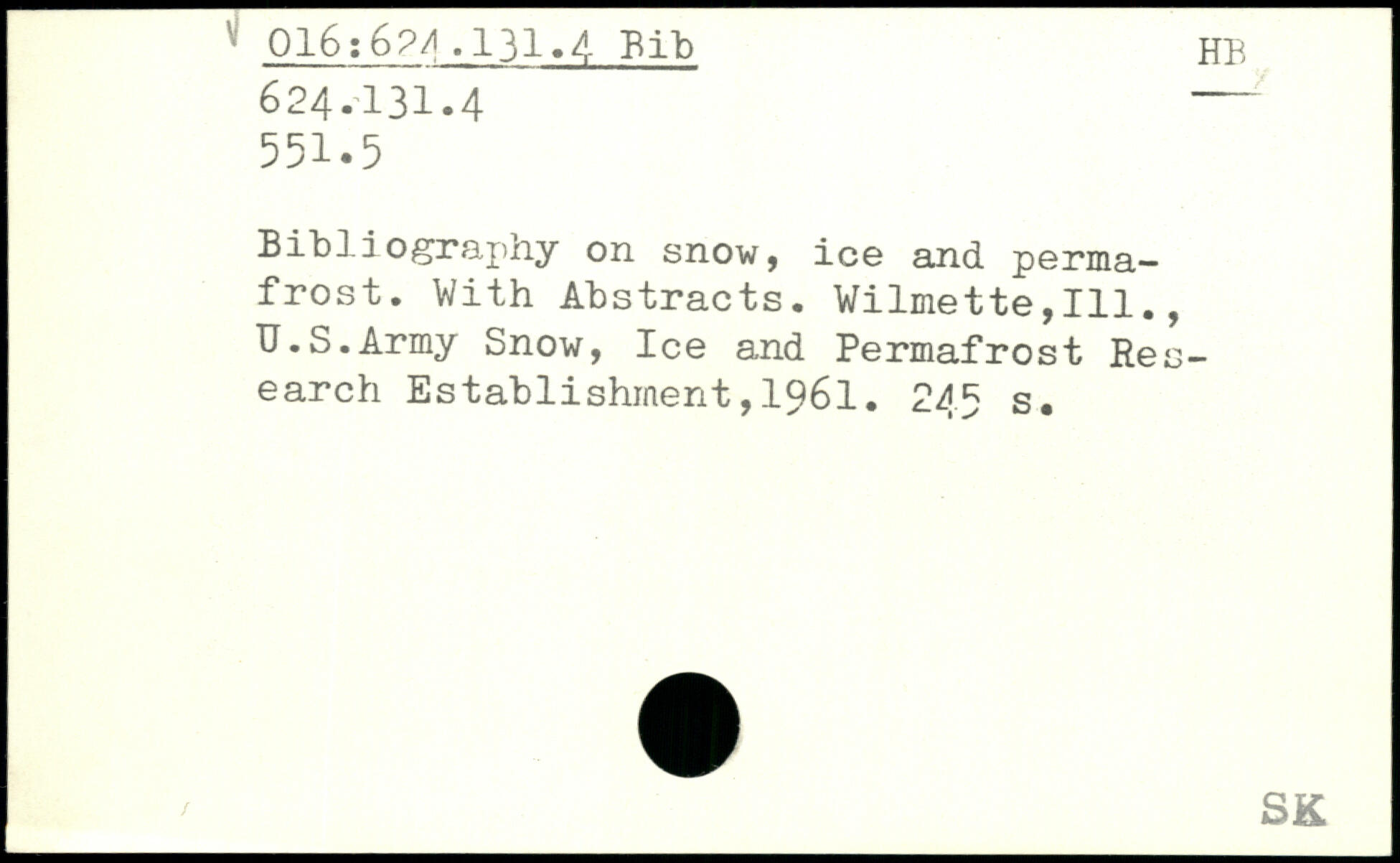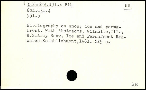 Bibliography on snow, ice and permafrost. With Abstracts. Wilmette,111., U.S.Army Snow, Ice and Permafrost Research Establishment,1961.