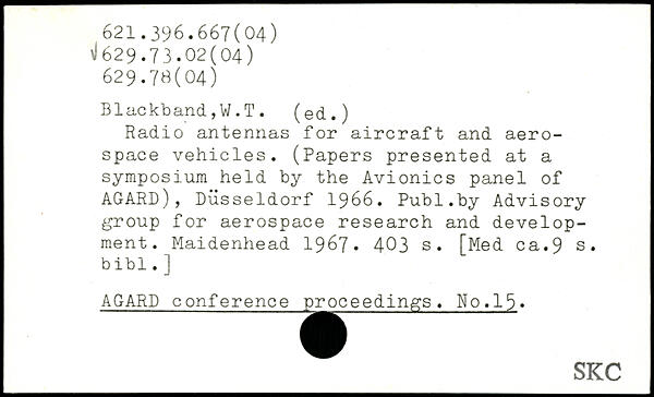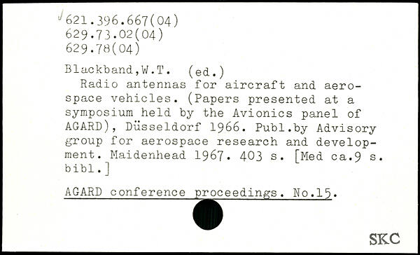 Radio antennas for aircraft and aerospace vehicles. (Papers presented at a symposium held by the Avionics panel of AGARD), Düsseldorf 1966.