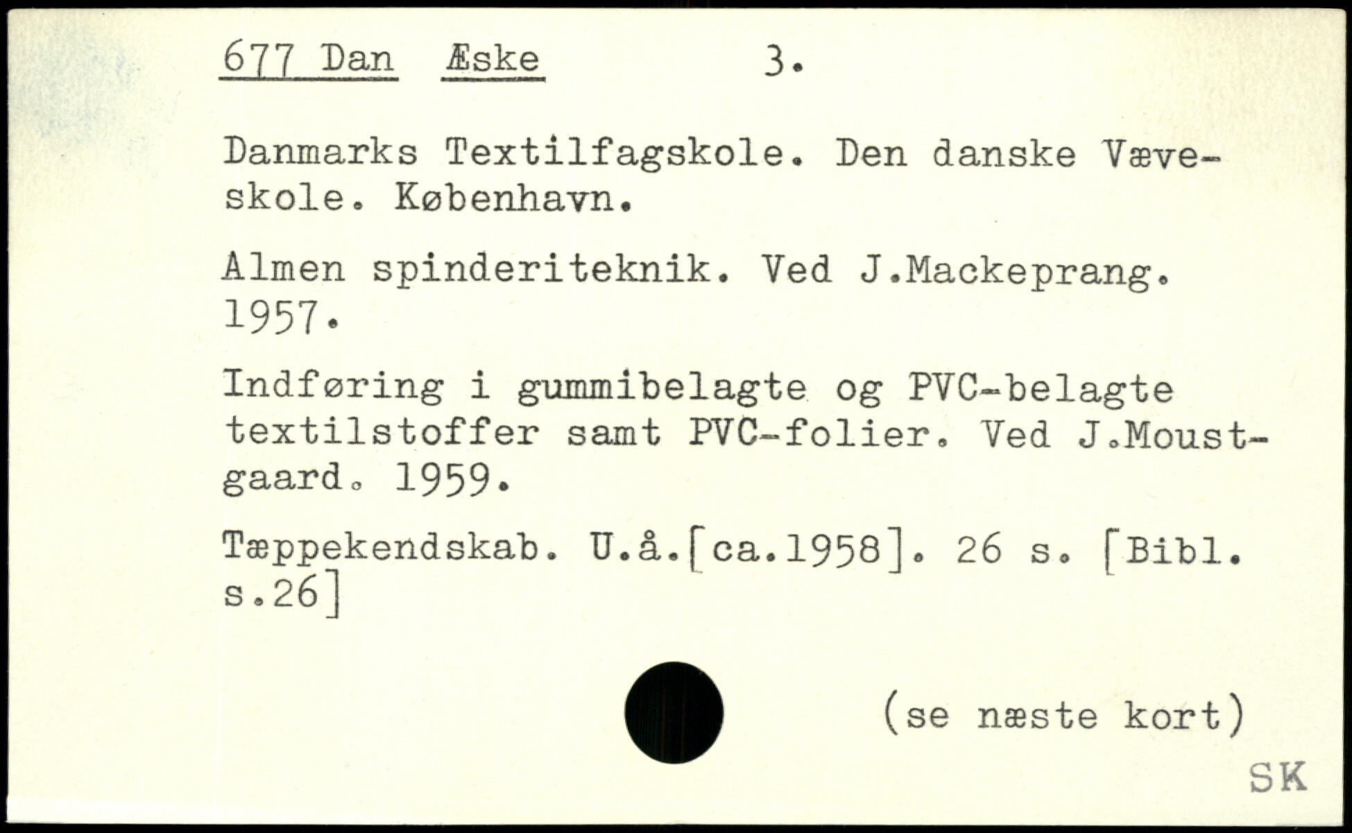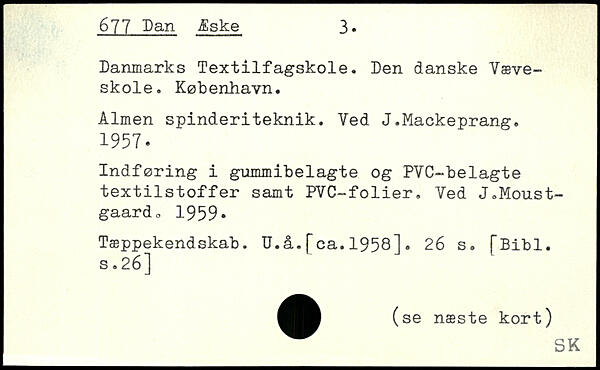 Danmarks Textilfagskole. Den danske Væveskole. København. Almen spinderiteknik. Ved J.Mackeprang. 1957. Indføring i gummibelagte og PVC-belagte textilstoffer samt PVC-folier. Ved J.Moust-gaardo 1959, Tæppekendskab. U.å.[ca.1958].