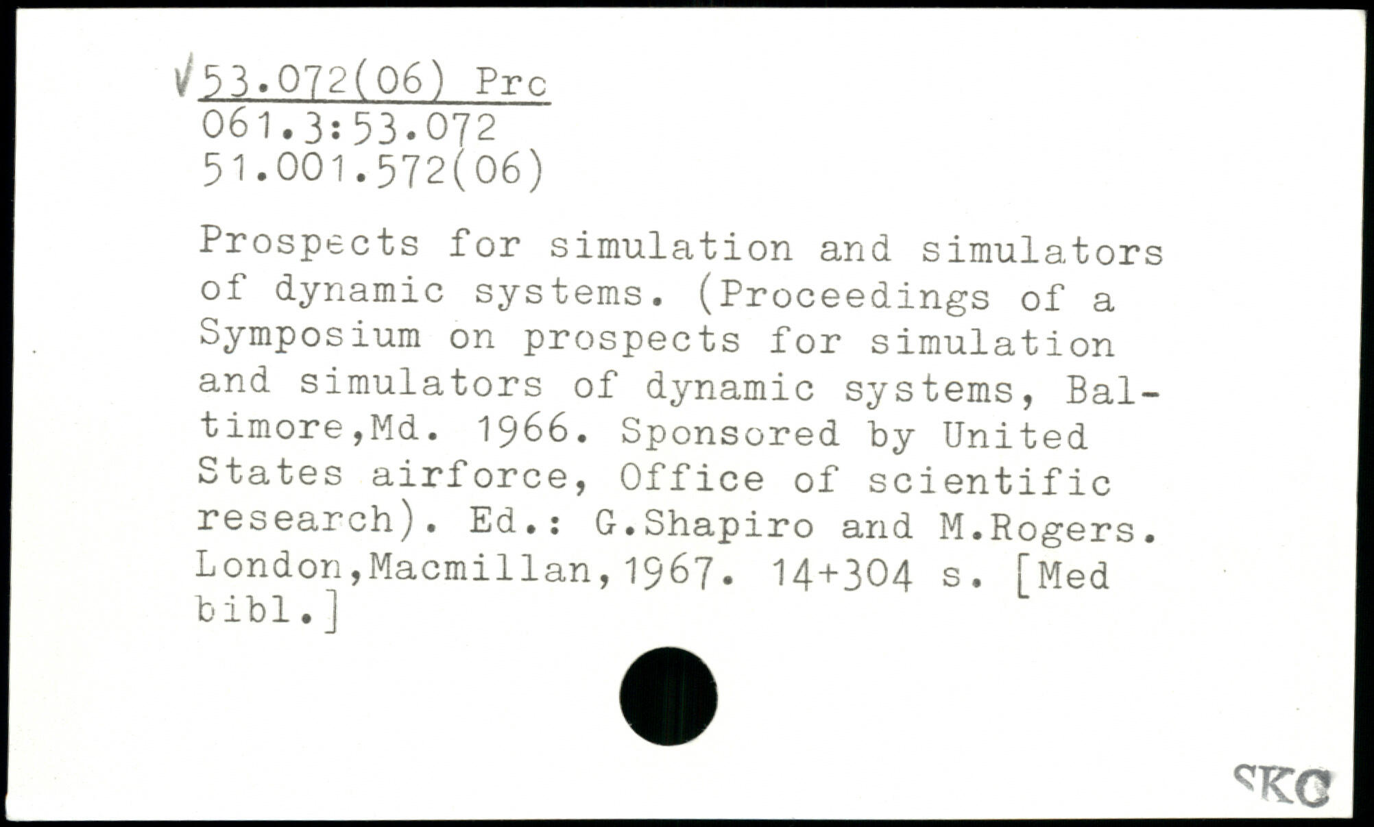 Prospects for simulation and simulators of dynamic systems. (Proceedings of a Symposium on prospects for simulation and simulators of dynamic systems, Baltimore,Md. 1966. Sponsored by United States airforce, Office of scientific research). Ed.: G.Shapiro and M.Rogers.