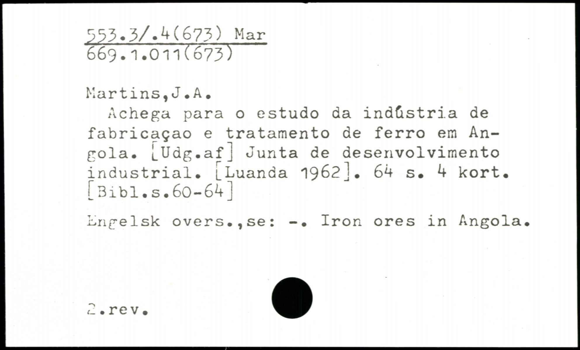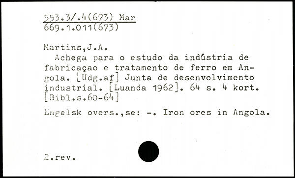 Achega para o estudo da indfistria de fabrica£ao e tratamento de ferro era Angola. l_Udg.af] Junta de desenvolvimento industrial. [Luanda 1962]. 6h s. A kort. [3ibl.s.60-6A] Ilngelsk overs. , se: -. Iron ores in Angola.