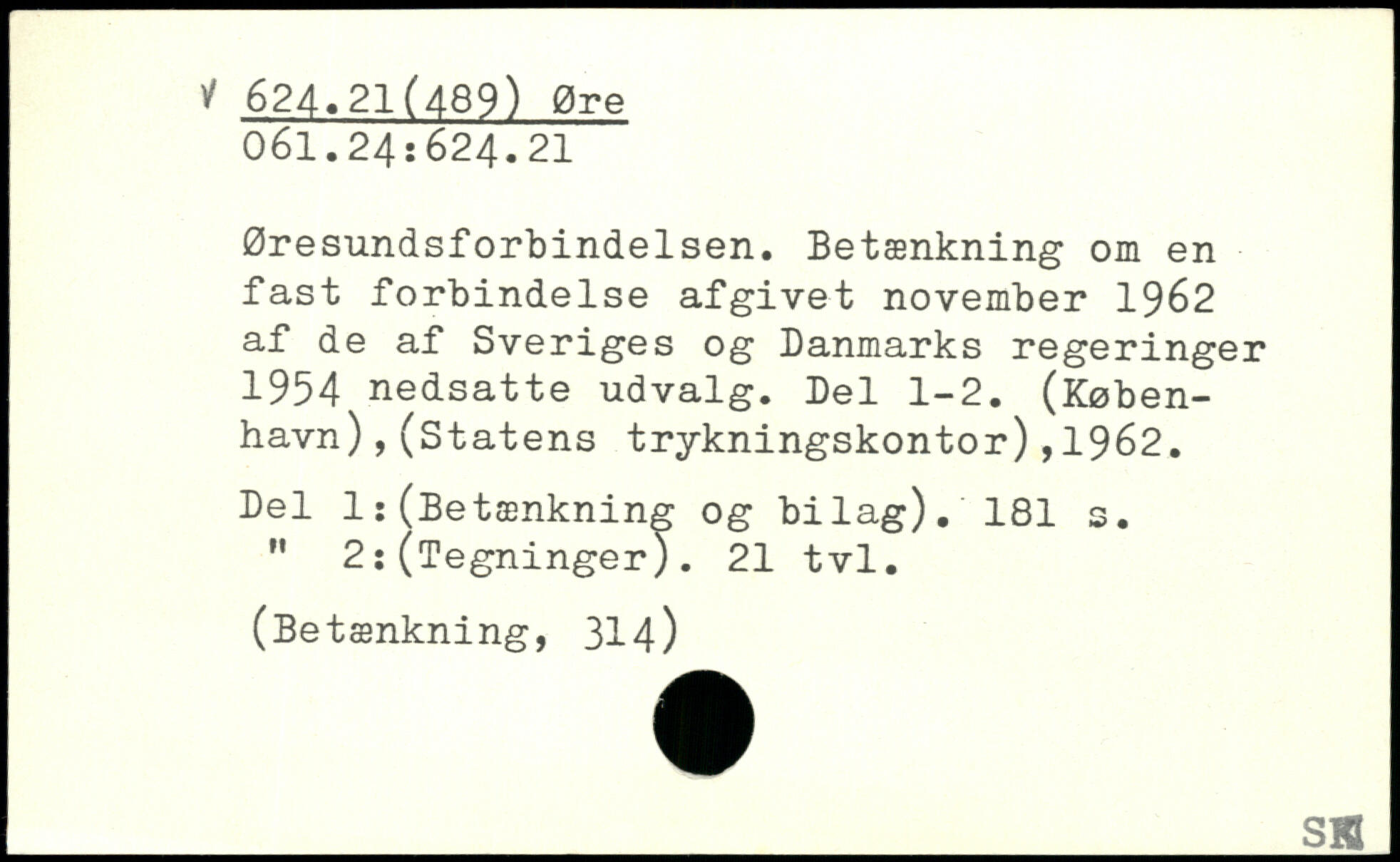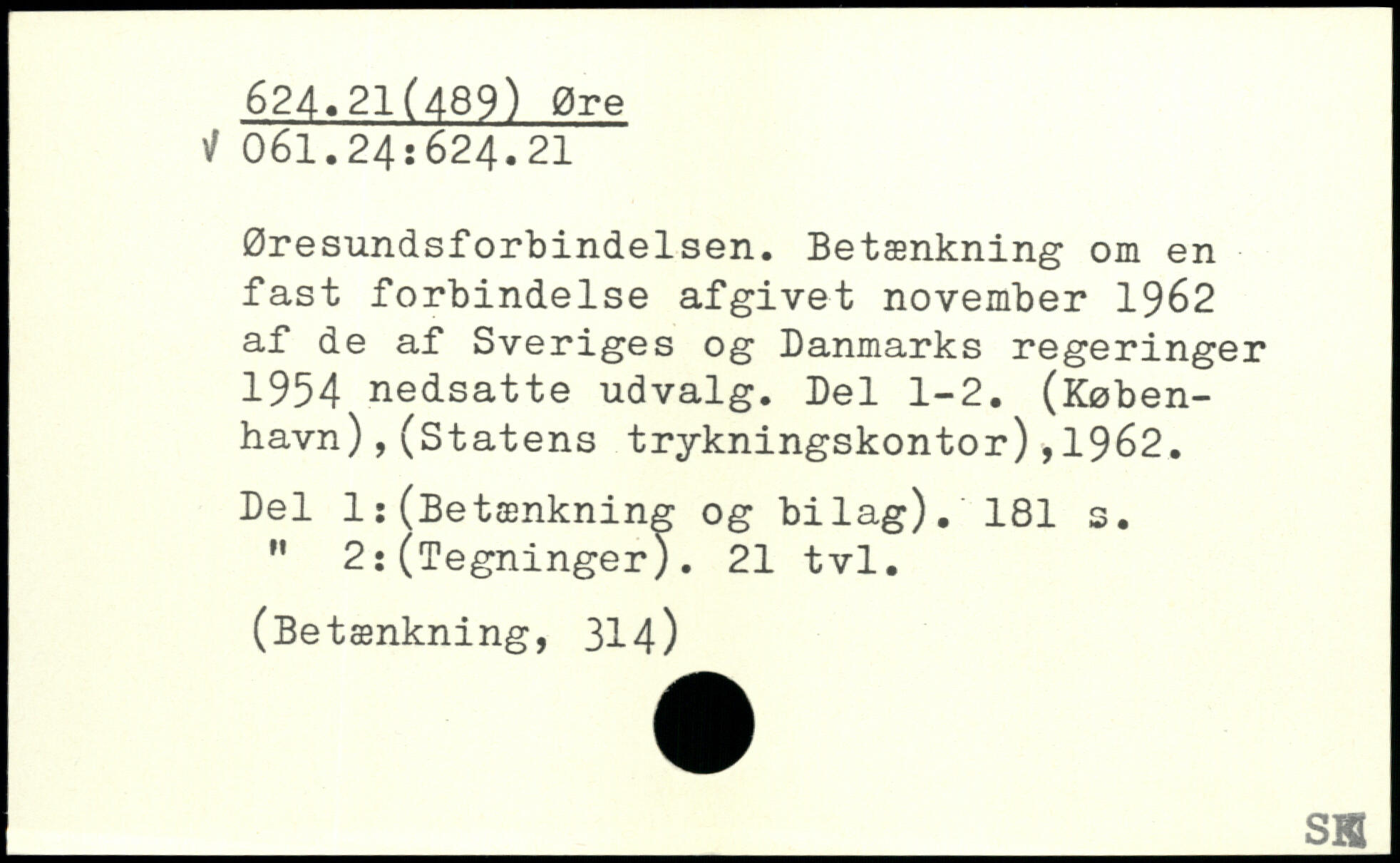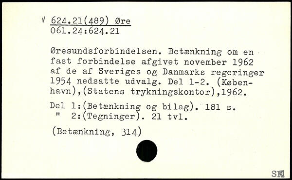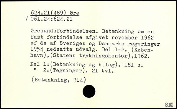 Øresundsforbindelsen. Betænkning om en fast forbindelse afgivet november 1962 af de af Sveriges og Danmarks regeringer 1954 nedsatte udvalg. Del 1-2. (København) ,(Statens trykningskontor),1962. Del 1:(Betænkning og bilag).