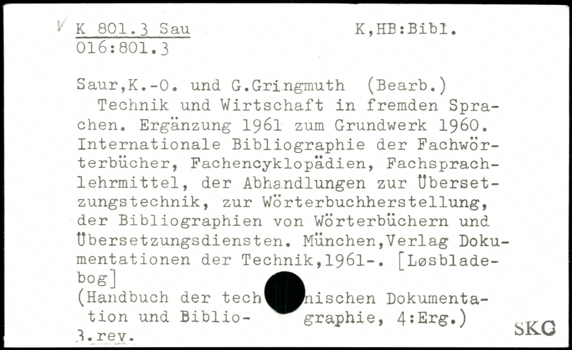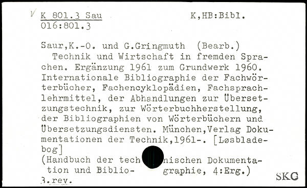 Technik und Wirtschaft in fremden Sprachen. Ergänzung 1961 zum Grundwerk 1960. Internationale Bibliographie der Fachwörterbücher, Fachencyklopädien, Fachsprach-1ehrmittel, der Abhandlungen zur Ubersetzungstechnik, zur Wörterbuchherstellung, der Bibliographien von Wörterbüchern und Ubersetzungsdiensten.