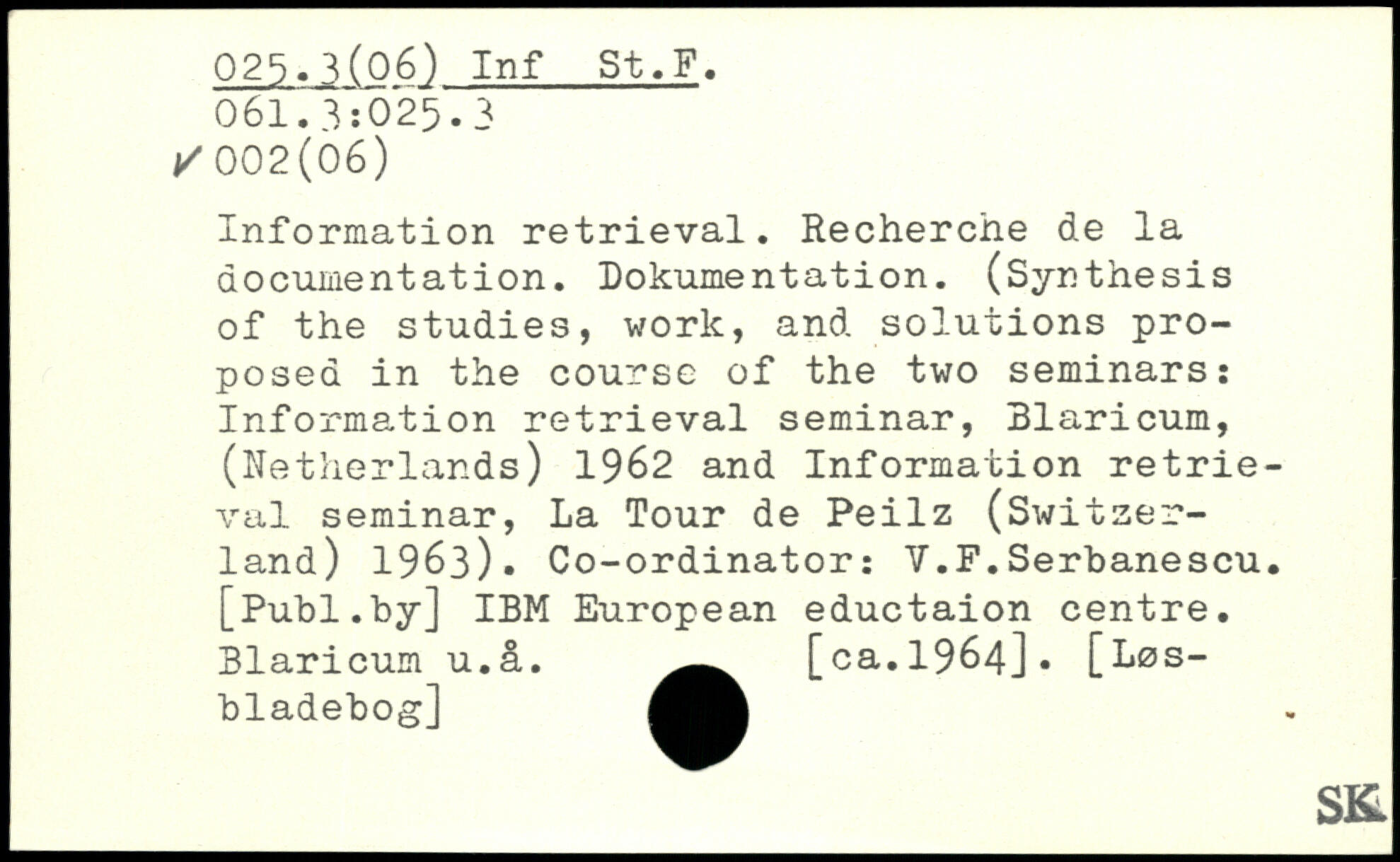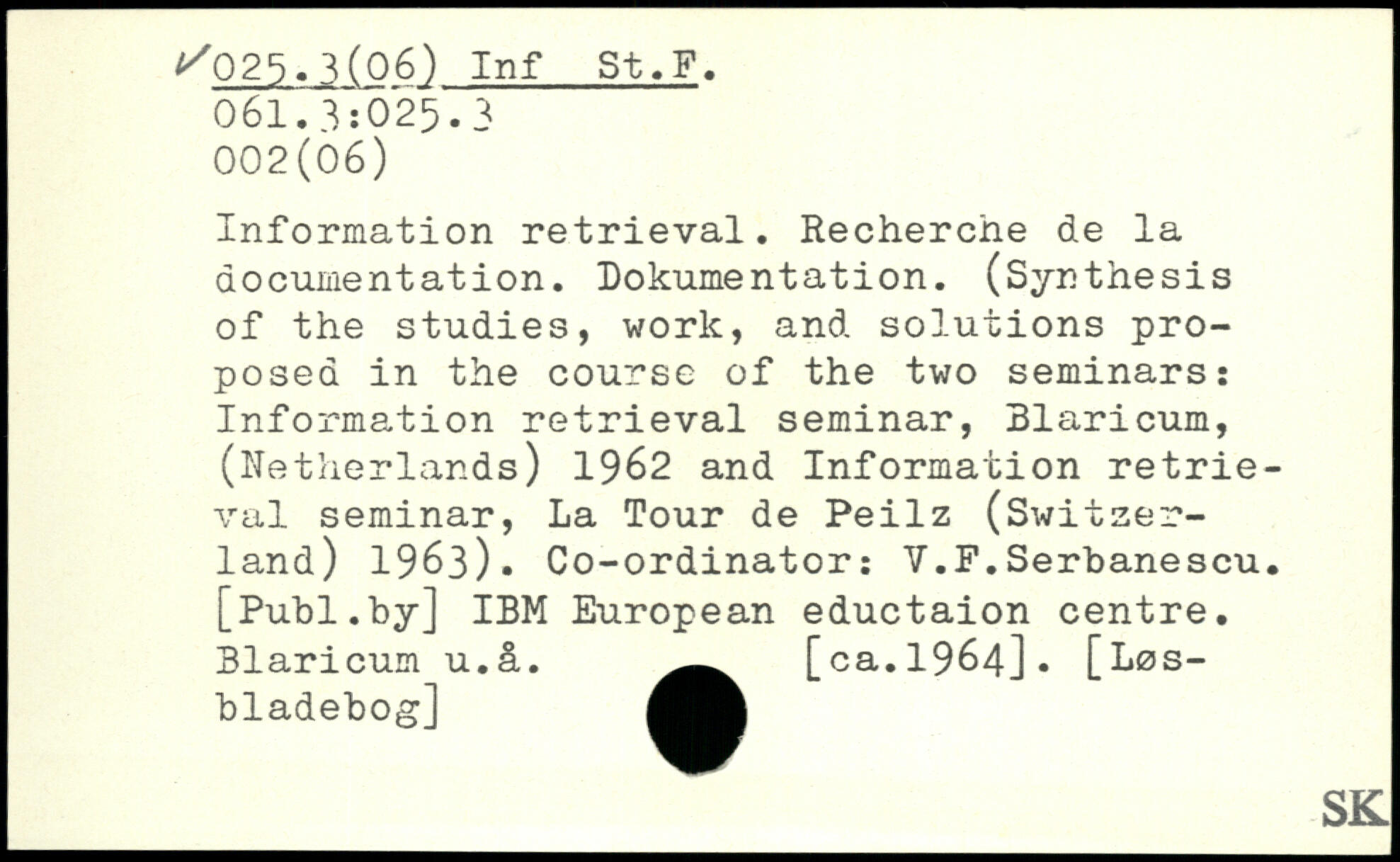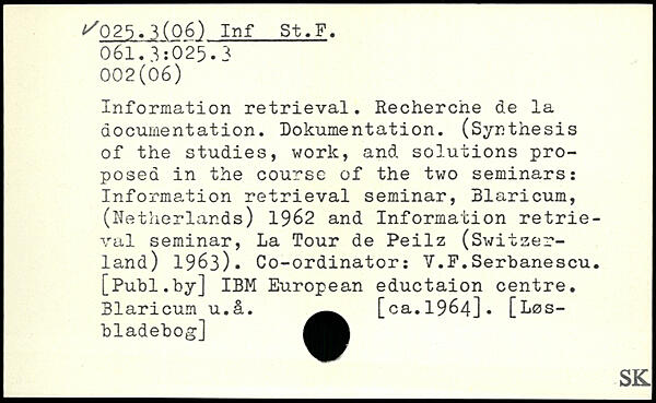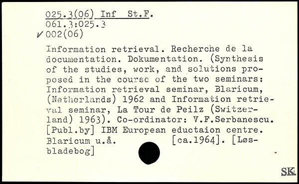 Information retrieval. Recherche de la documentation. Dokumentation. (Synthesis of the studies, work, and solutions proposed in the course of the two seminars: Information retrieval seminar, Blaricum, (Netherlands) 1962 and Information retrieval seminar, La Tour de Peilz (Switzerland) 1963). Co-ordinator: Y.F.Serbanescu.