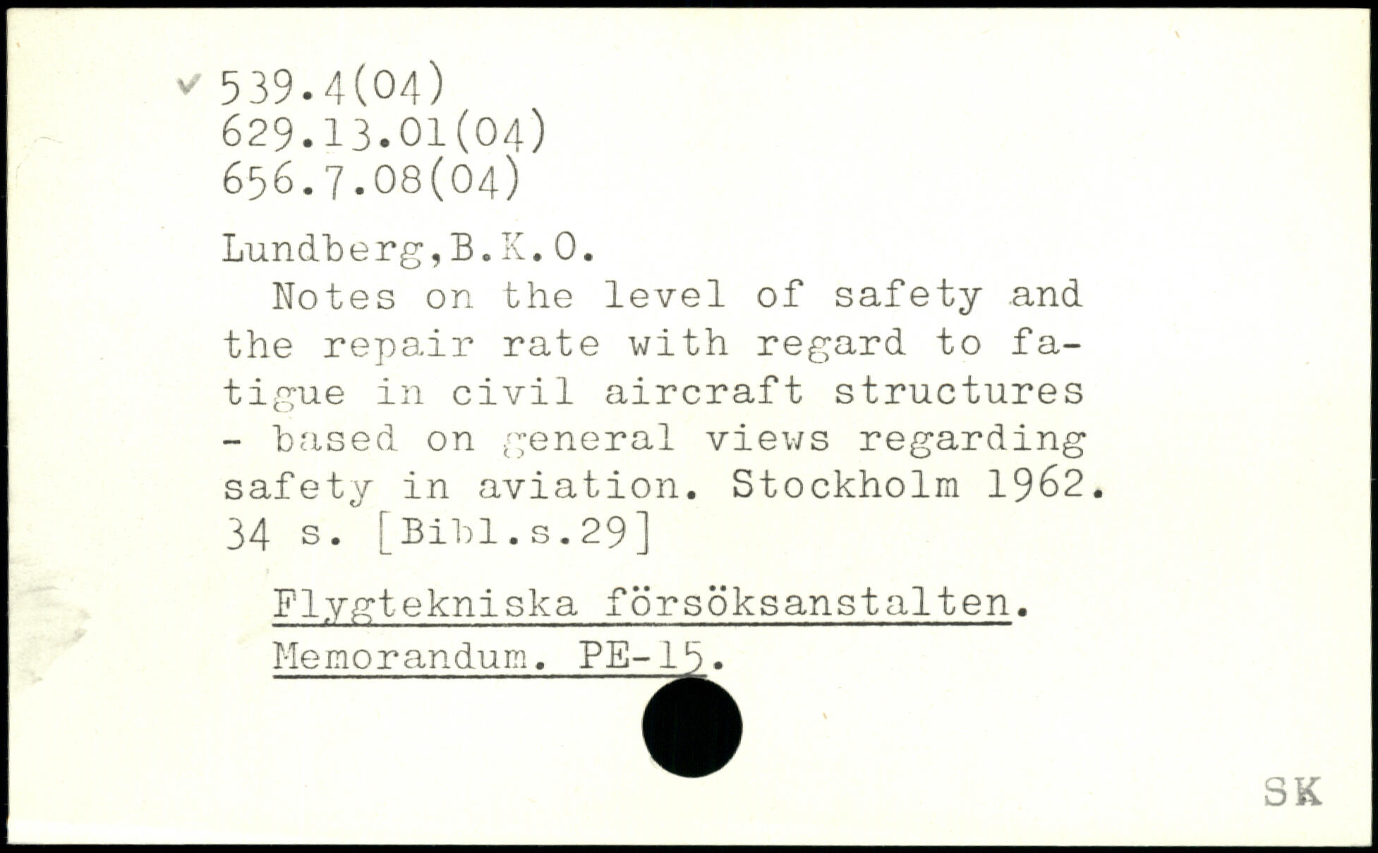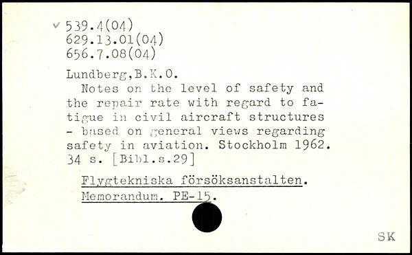 Lundb e rg,B.K.0. Notes on the level of safety and the repair rate with regard to fatigue in civil aircraft structures - based on general views regarding safety in aviation.