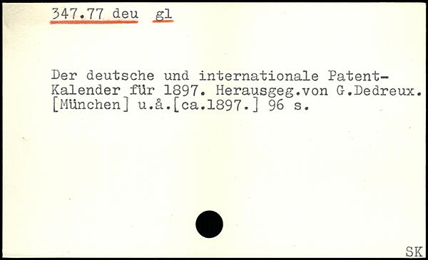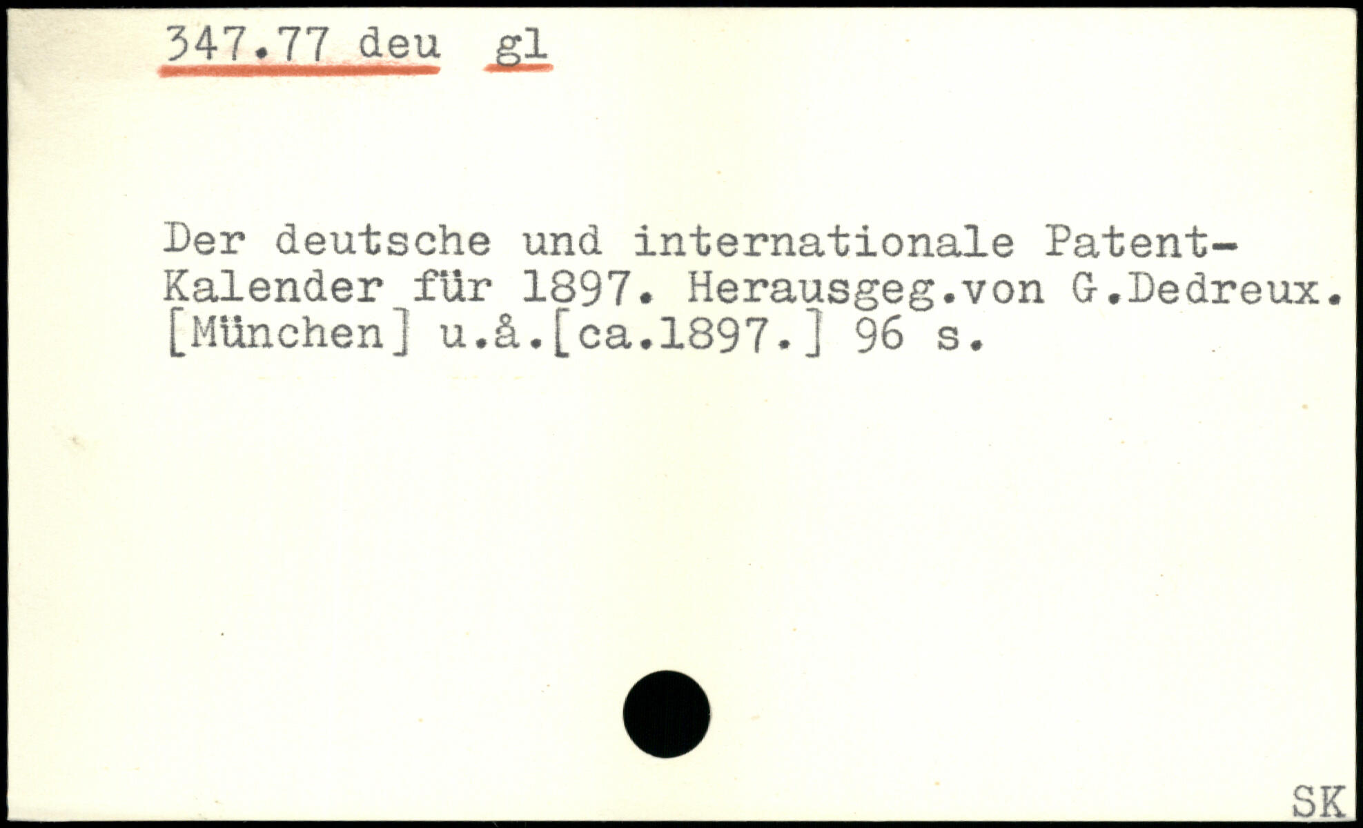 Der deutsche und internationale Patent-Kalender für 1897. Herausgeg.von G.Dedreux. [München] u.ä.[ca.1897.]