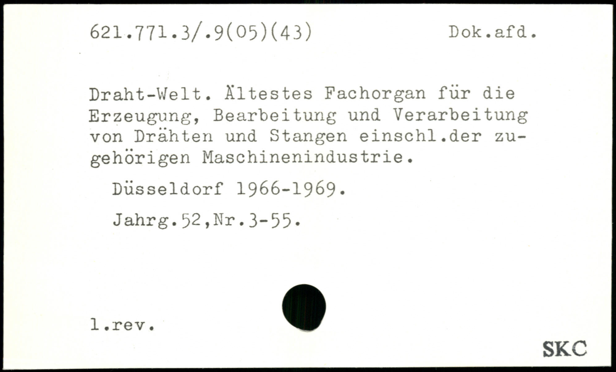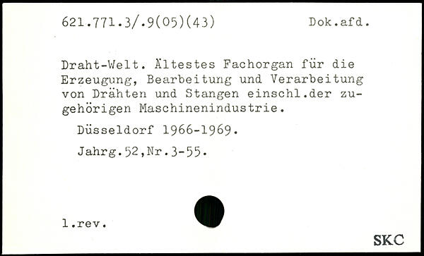 Draht-Welt. Ältestes Fachorgan für die Erzeugung, Bearbeitung und Verarbeitung von Drähten und Stangen einschl.der zugehörigen Maschinenindustrie. Düsseldorf 1966-1969. Jahrg.52,Nr.3-55.