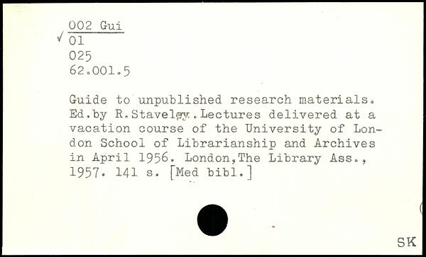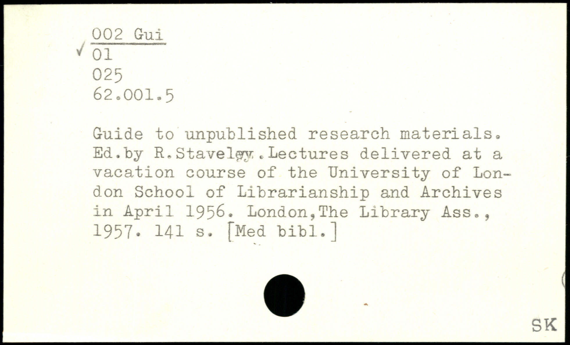 Guide to unpublished research materials, Ed.by R.Stavel^y ,Lectures delivered at a vacation course of the University of London School of Librarianship and Archives in April 1956. London,The Library Ass,, 1957.