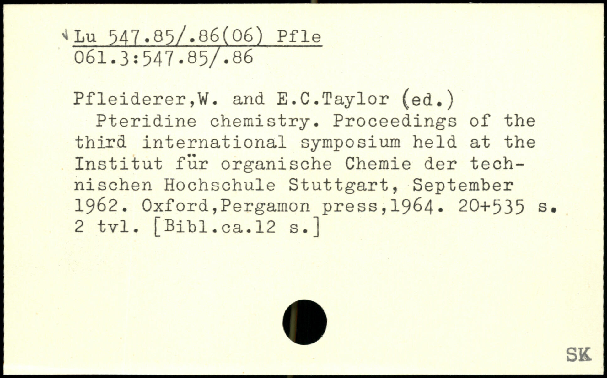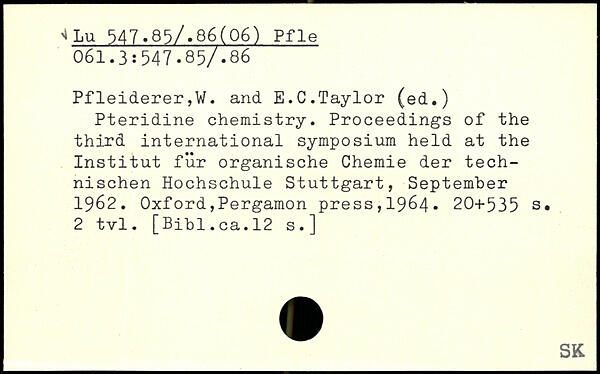 Pteridine chemistry. Proceedings of the third international symposium held at the Institut für organische Chemie der technischen Hochschule Stuttgart, September 1962.