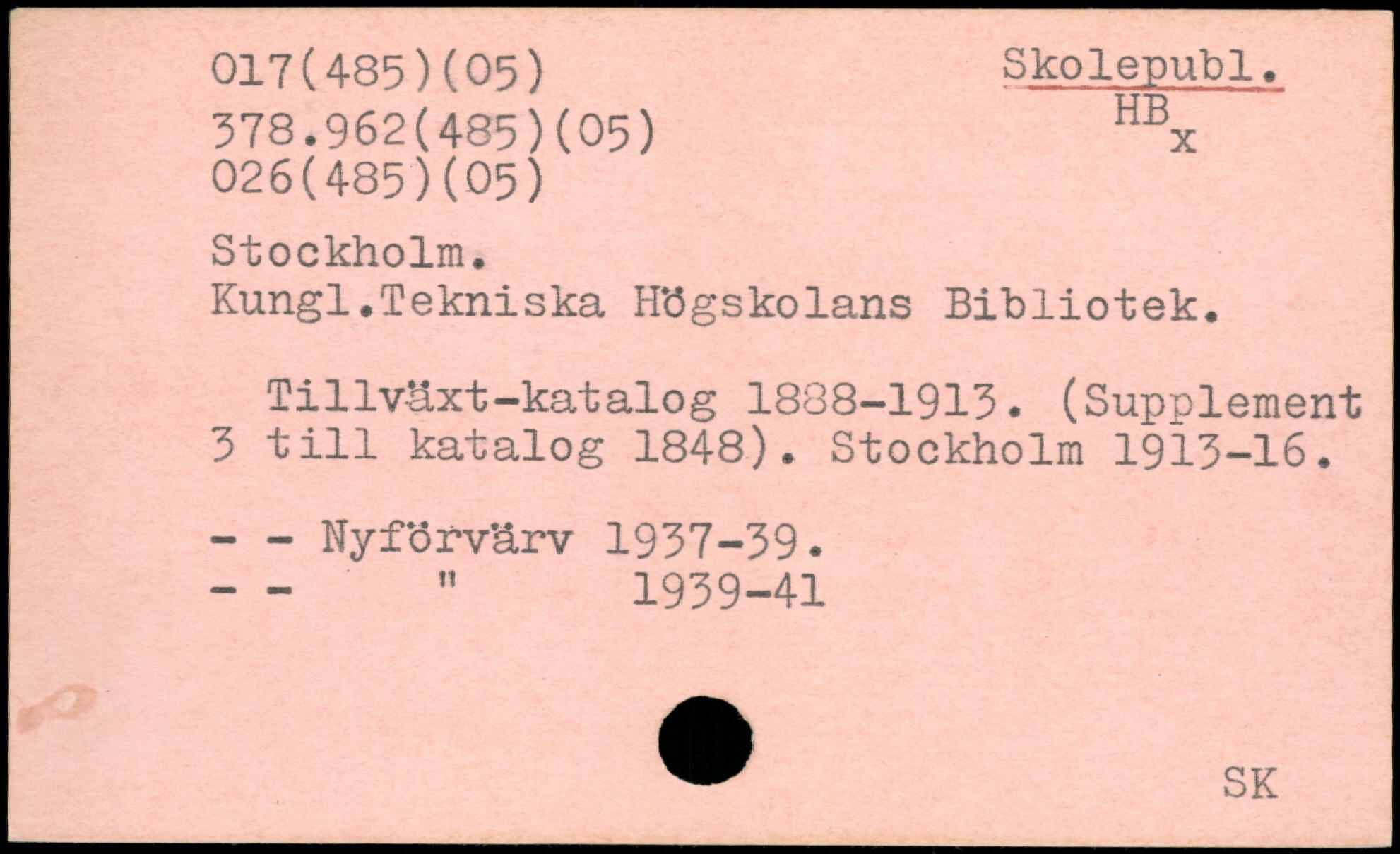 Kungl.Tekniska Högskolans Bibliotek. Tillväxt-katalog 1888-1913. (Supplement 3 till katalog 1848).