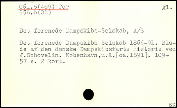 1.5US9) for gi. 656.0(06) Det forenede Dampskibs-Selskab, A/S Det forenede Dampskibs Selskab 1866-91. Blade af den danske Dampskibsfarts Historie ved J.Schovelin. København,u.å.[ca.1891]. 109+