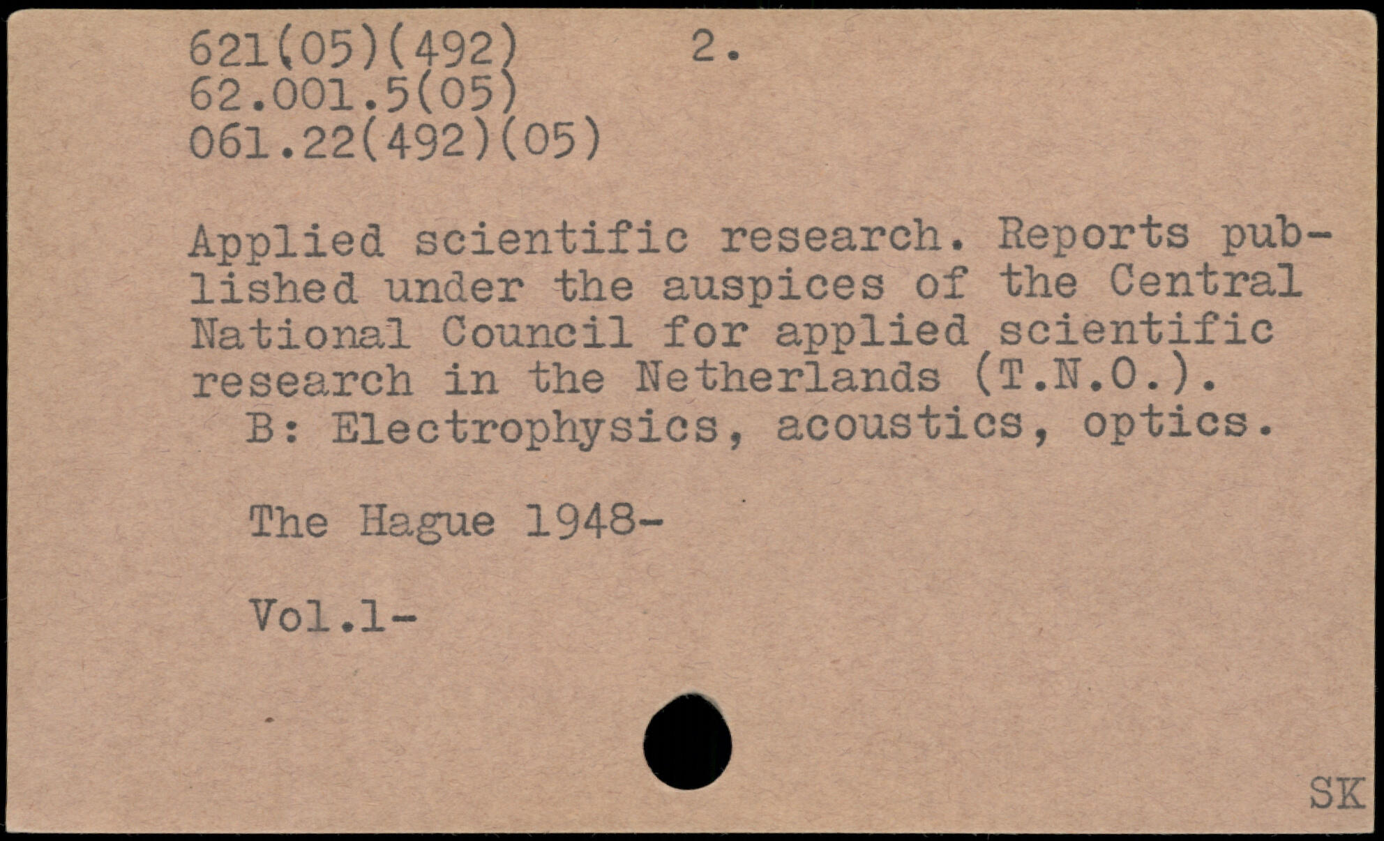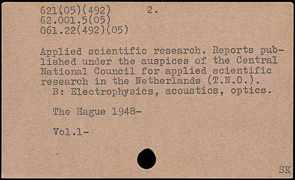 Applied scientific research. Reports published under the auspices of the Central National Council for applied scientific research in the Netherlands (T.N.O.). B: Electrophysics, acoustics, optics.