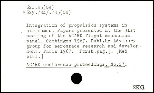 Integration of propulsion systems in airframes. Papers presented at the 31st meeting of the AGARD flight mechanics panel, Gottingen 1967