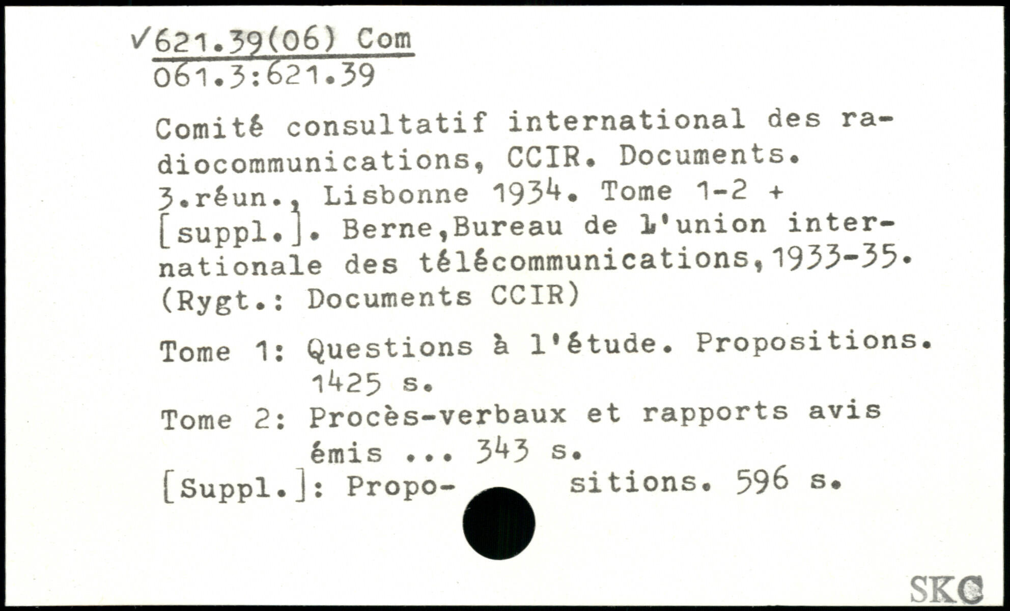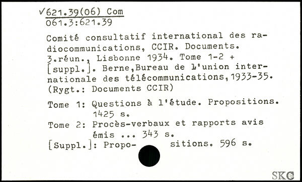 Comité consultatif international des radiocommunications, CCIR. Documents. 3.réun., Lisbonne 193^. Tome 1-2 + [suppl.J. Berne,Bureau de l’union internationale des télécommunications,1933-33, (Rygt.: Documents CCIR) Tome 1: Questions à l’étude. Propositions. 1.