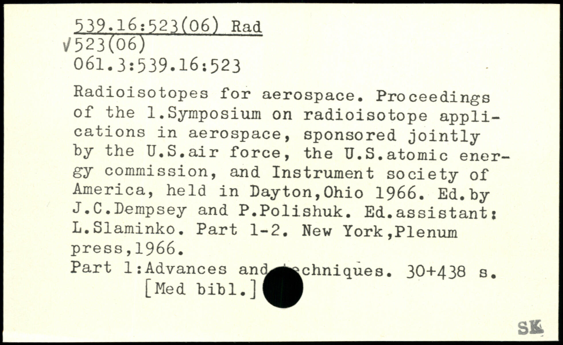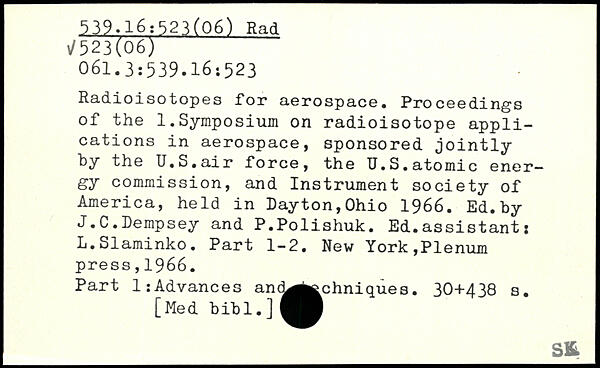 Radioisotopes for aerospace. Proceedings of the 1.Symposium on radioisotope applications in aerospace, sponsored jointly by the U.S.air force, the U.S.atomic energy commission, and Instrument society of America, held in Dayton,Ohio 1966. Ed. by J.C.Dempsey and P.Polishuk. Ed.assistant : L.Slaminko. Part 1-2.