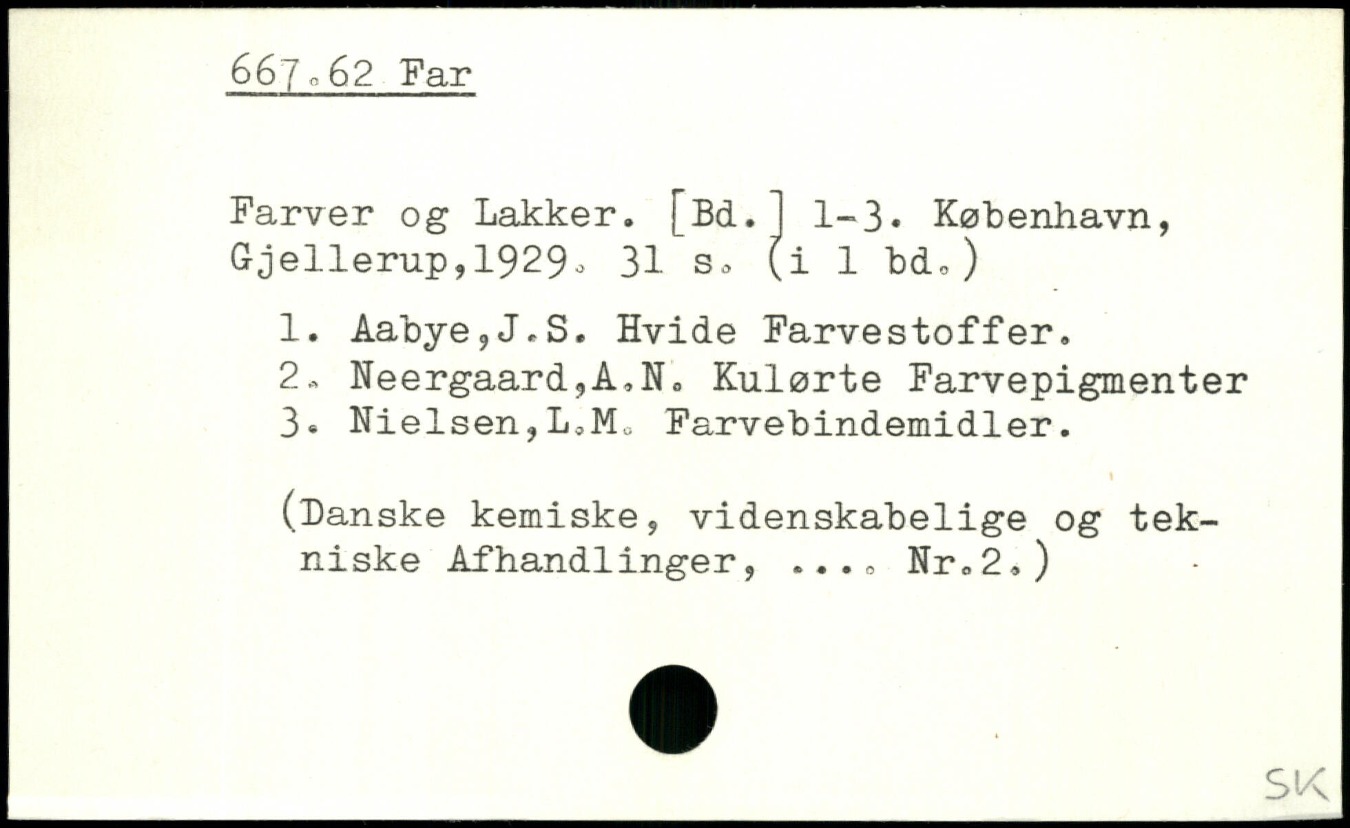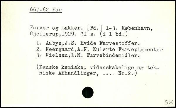 1. Aabye,J.S. Hvide Farvestoffer. 2- Neergaard,A,N0 Kulørte Farvepigmenter 3, Nielsen,LaM, Farvebindemidler.