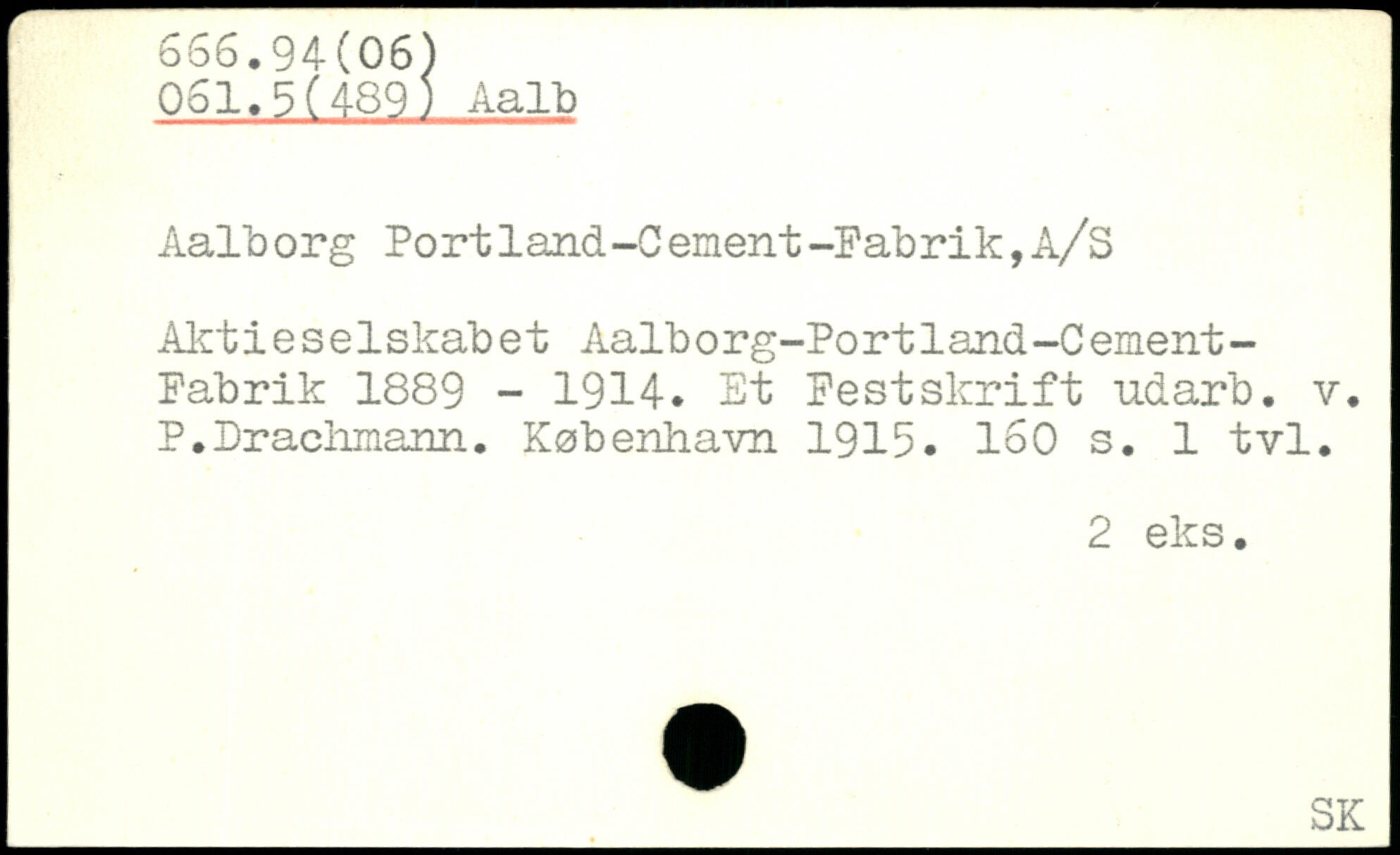 Aalbo r g Portiand-C ement-Fabrik, A/S Ale t ieselskabet Aalb o rg-Po r11 and -C ement -Fabrik 1889 - 1914. Et Festskrift udarb. v. P.Prachmann.