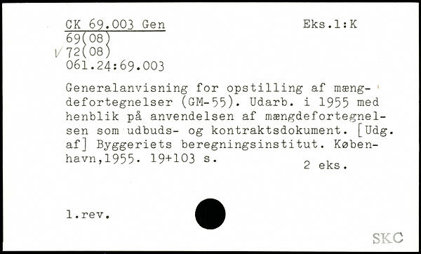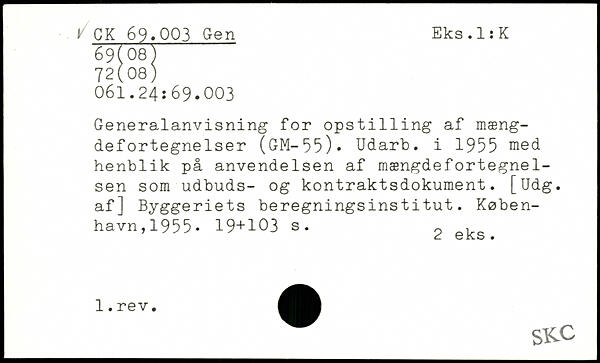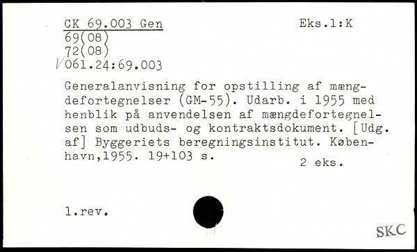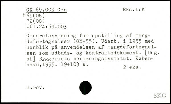 Generalanvisning for opst1111ng af mængdef ortegnelser (GM-55). Udarb. i 1955 med henblik på anvendelsen af mængdefortegnel-sen som udbuds- og kontraktsdokument. [Udg. af] Byggeriets beregningsinstitut. København, 1955.