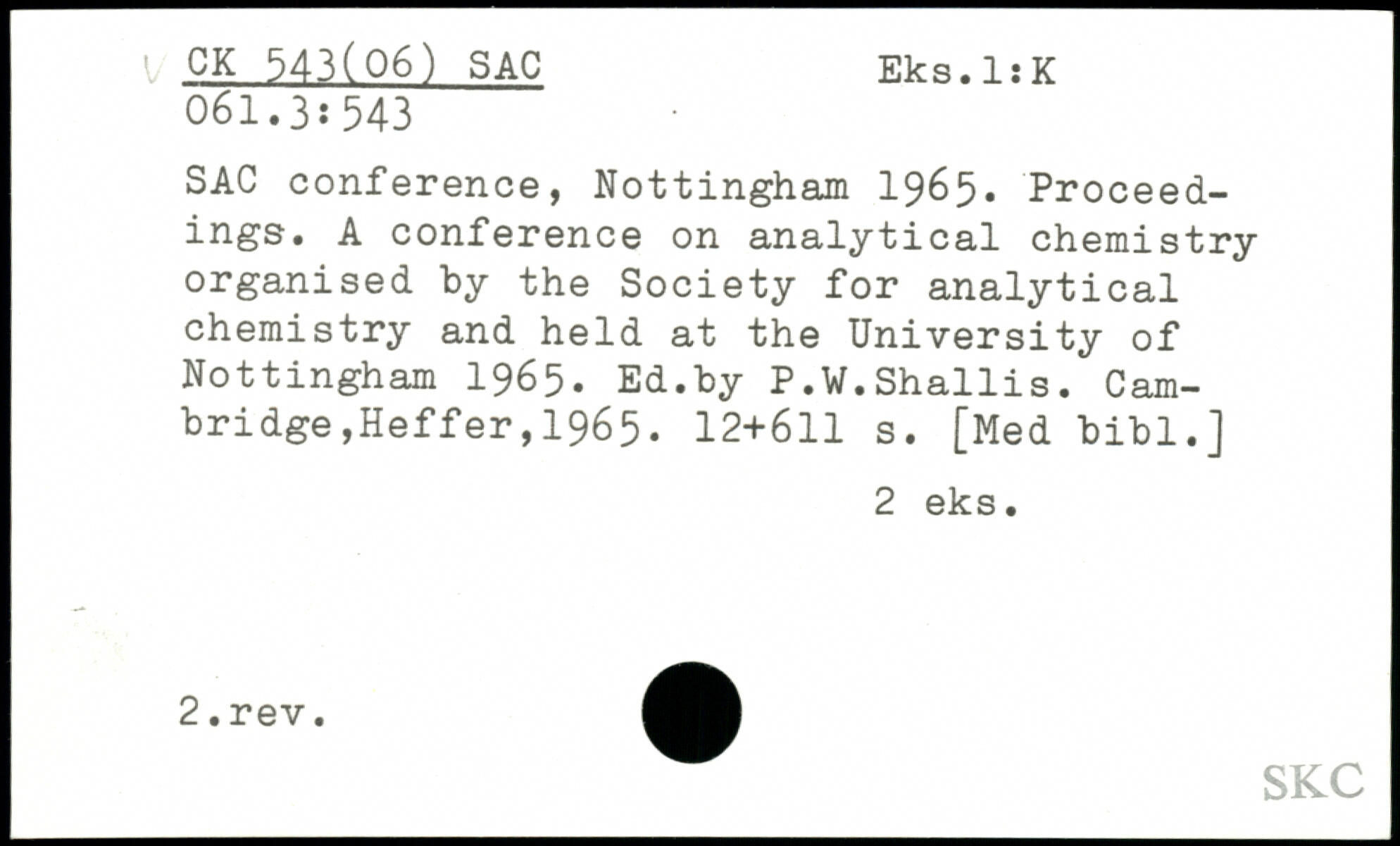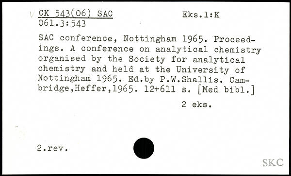 SAC conference, Nottingham 1965. Proceedings. A conference on analytical chemistry organised by the Society for analytical chemistry and held at the University of Nottingham 1965. Ed.by P.W.Shallis.