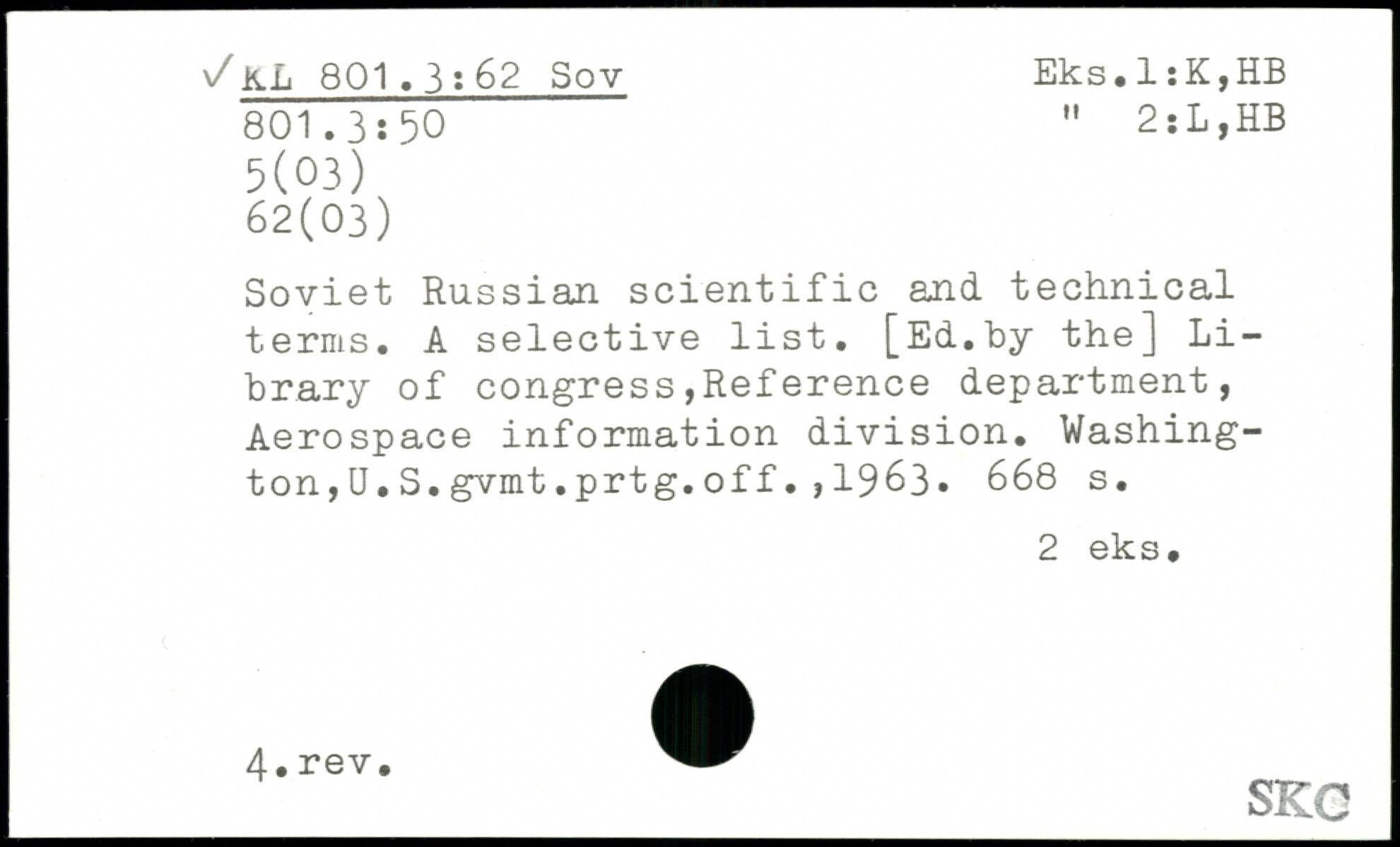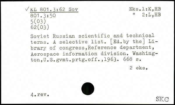 Soviet Russian scientific and technical terms. A selective list. [Ed.by the] Library of congress,Reference department, Aerospace information division. Washington , U. S. gvmt. prtg. of f ., 1963.