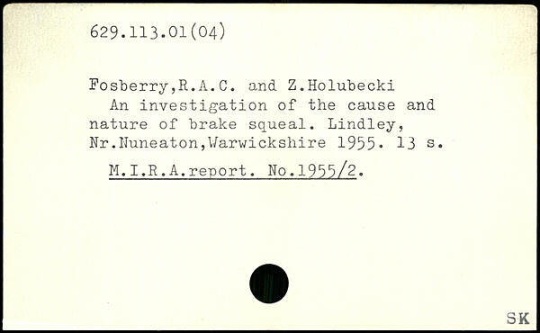 Fosberry,R.A.C. and Z.Holubecki An investigation of the cause and nature of brake squeal. Lindley, Nr.Nuneaton Warwickshire 1955.