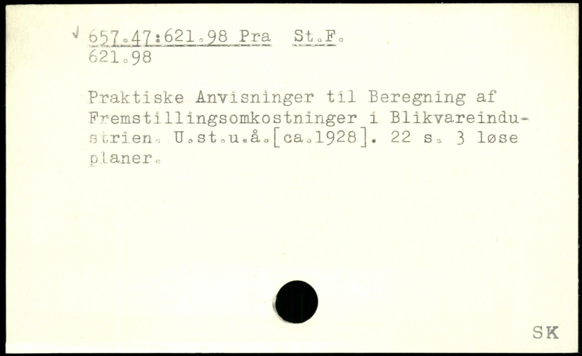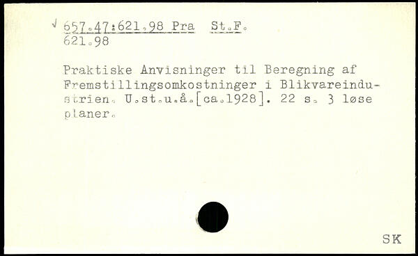 Praktiske Anvisninger til Beregning af Fremst1111ngsomkostninger i Blikvareindustrien, U0stoU.åo[cau1928].