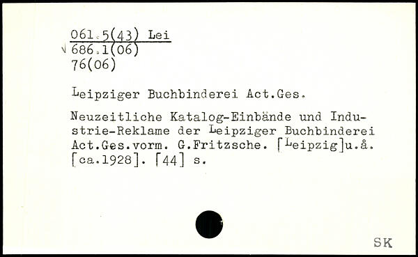 Leipziger Buchbinderei Act.Ges. Neuzeitliche Katalog-Einbände und Industrie-Reklame der Leipziger Buchbinderei Act.Ges.vorm. G.Fritzsche. fLeipzigju.ä. [ca.1928]. [44] s.