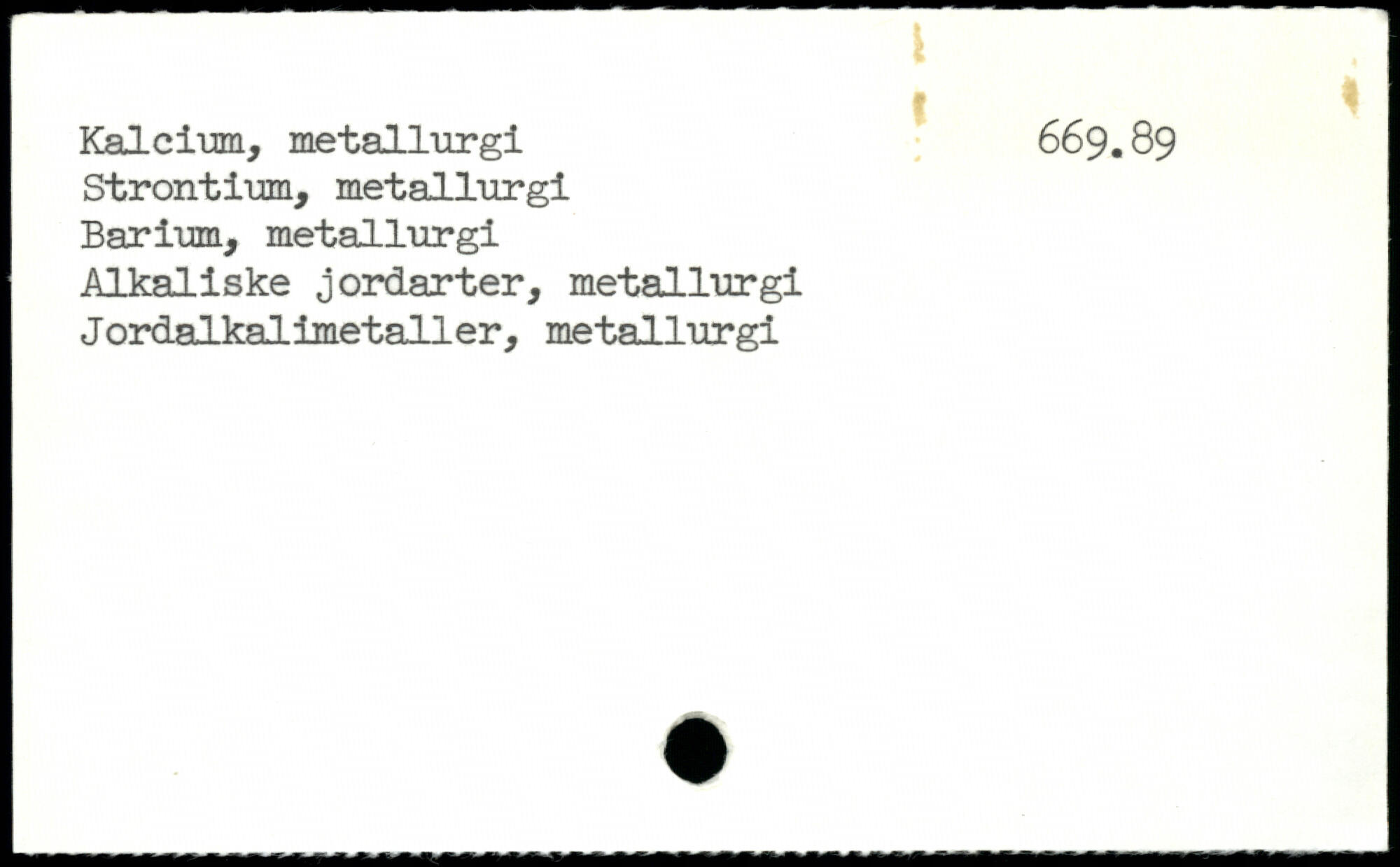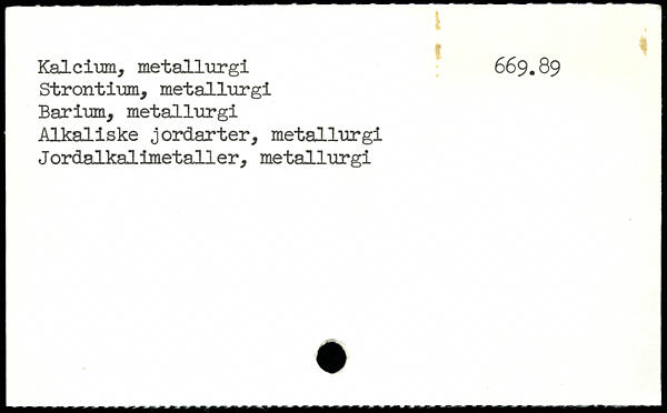 t I Kalcium, metallurgi 669.89 j Strontium, metallurgi Barium, metallurgi Alkaliske jordarter, metallurgi Jordalkalimetaller, metallurgi