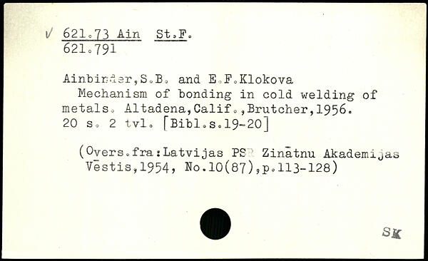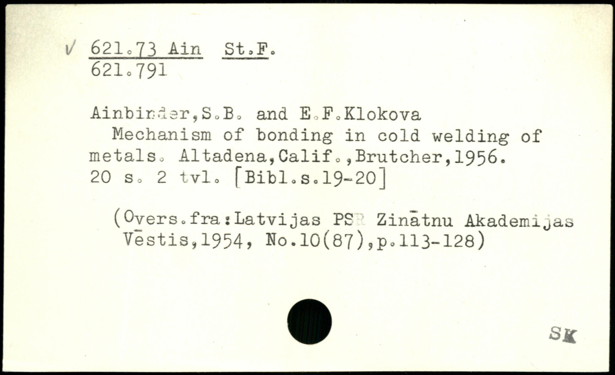 Mechanism of bonding in cold welding of metals. Altadena,Calif0,Brutcher,1956.
