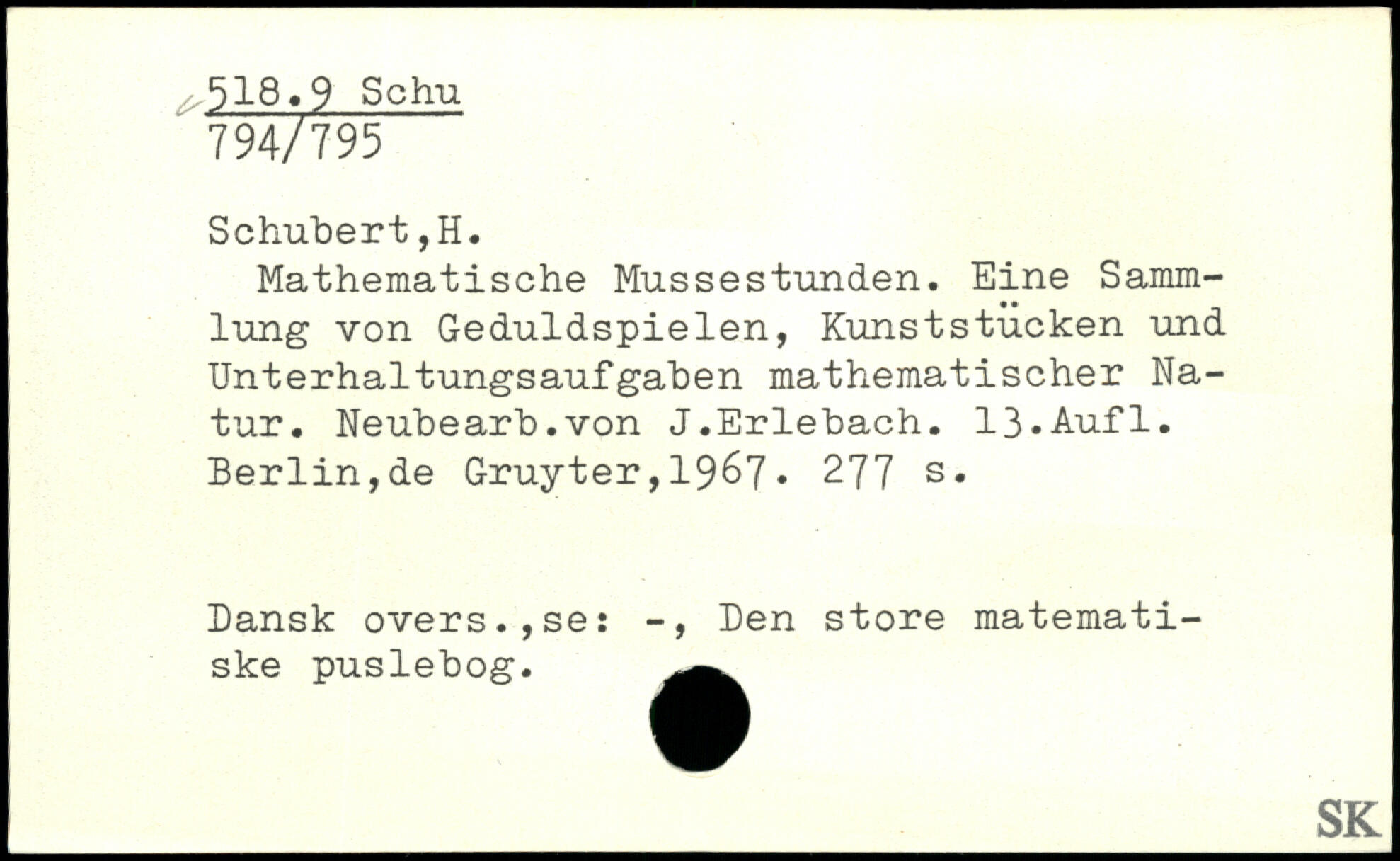 Mathematische Mussestunden. Eine Sammlung von Geduldspielen, Kunststücken und Unterhaltungsaufgaben mathematischer Natur. Neubearb.von J.Erlebach.