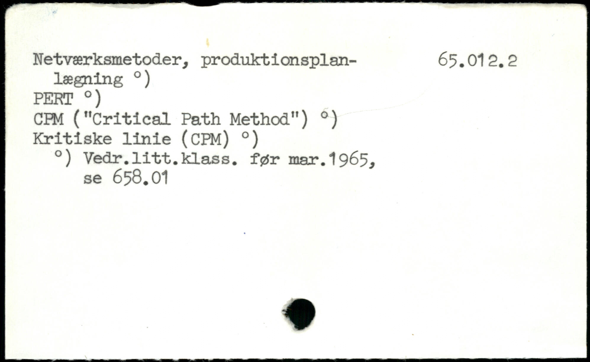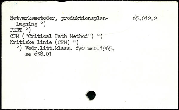 Netværksmetoder, produktionsplan- 65.012.2 lægning .) PERT .) CPM ("Critical Path Method") .) Kritiske linie (CFM) .) .) Vedr.litt.klass. før mar.1965, se 658.01
