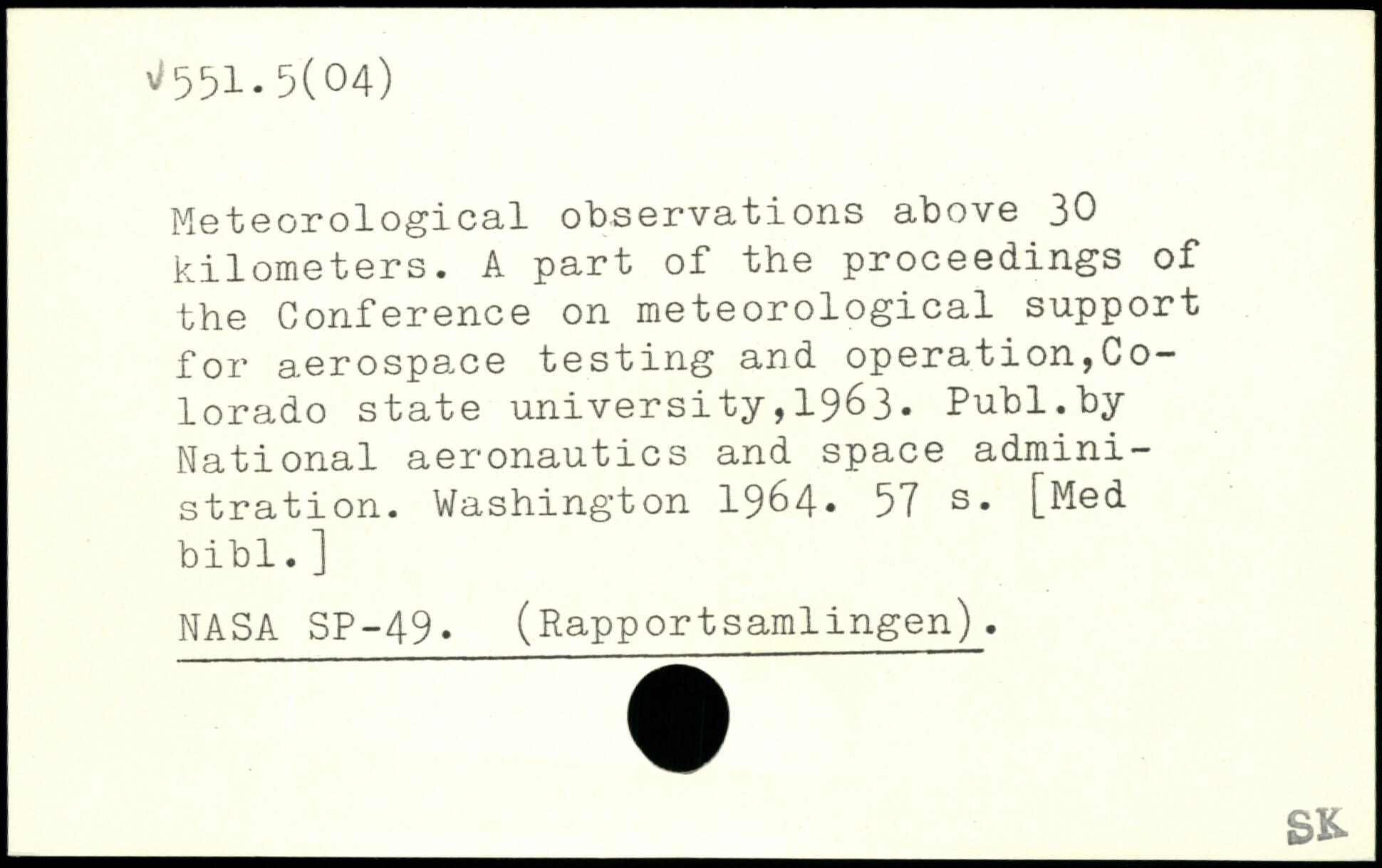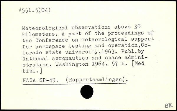 Meteorological observations above 30 kilometers. A part of the proceedings of the Conference on meteorological support for aerospace testing and operation,Colorado state university,1963.