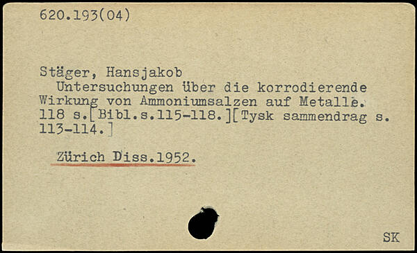Stager, Hansjakob Untersuchungen über die korrodierende Wirkung von Ammoniumsalzen auf Metalle.