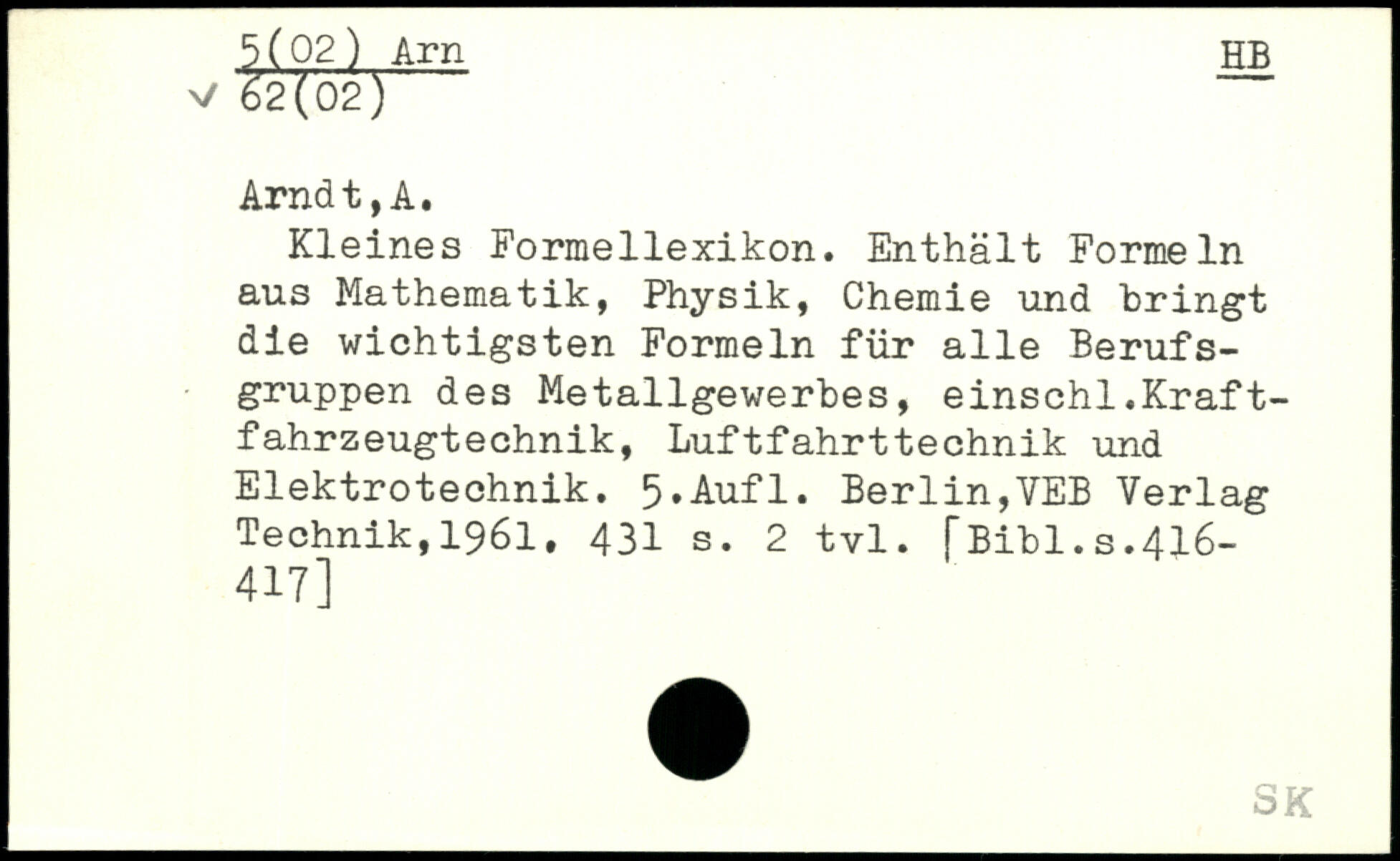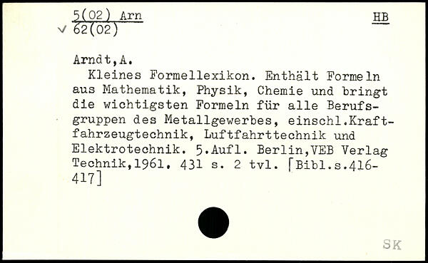 Kleines Formellexikon. Enthält Formeln aus Mathematik, Physik, Chemie und bringt die wichtigsten Formeln für alle Berufsgruppen des Metallgewerbes, einschl.Kraftfahrzeugtechnik, Luftfahrttechnik und Elektrotechnik.