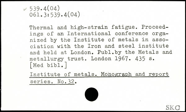 Thermal and high-strain fatigue. Proceedings of an International conference organized by the Institute of metals in association with the Iron and steel institute and held at London.