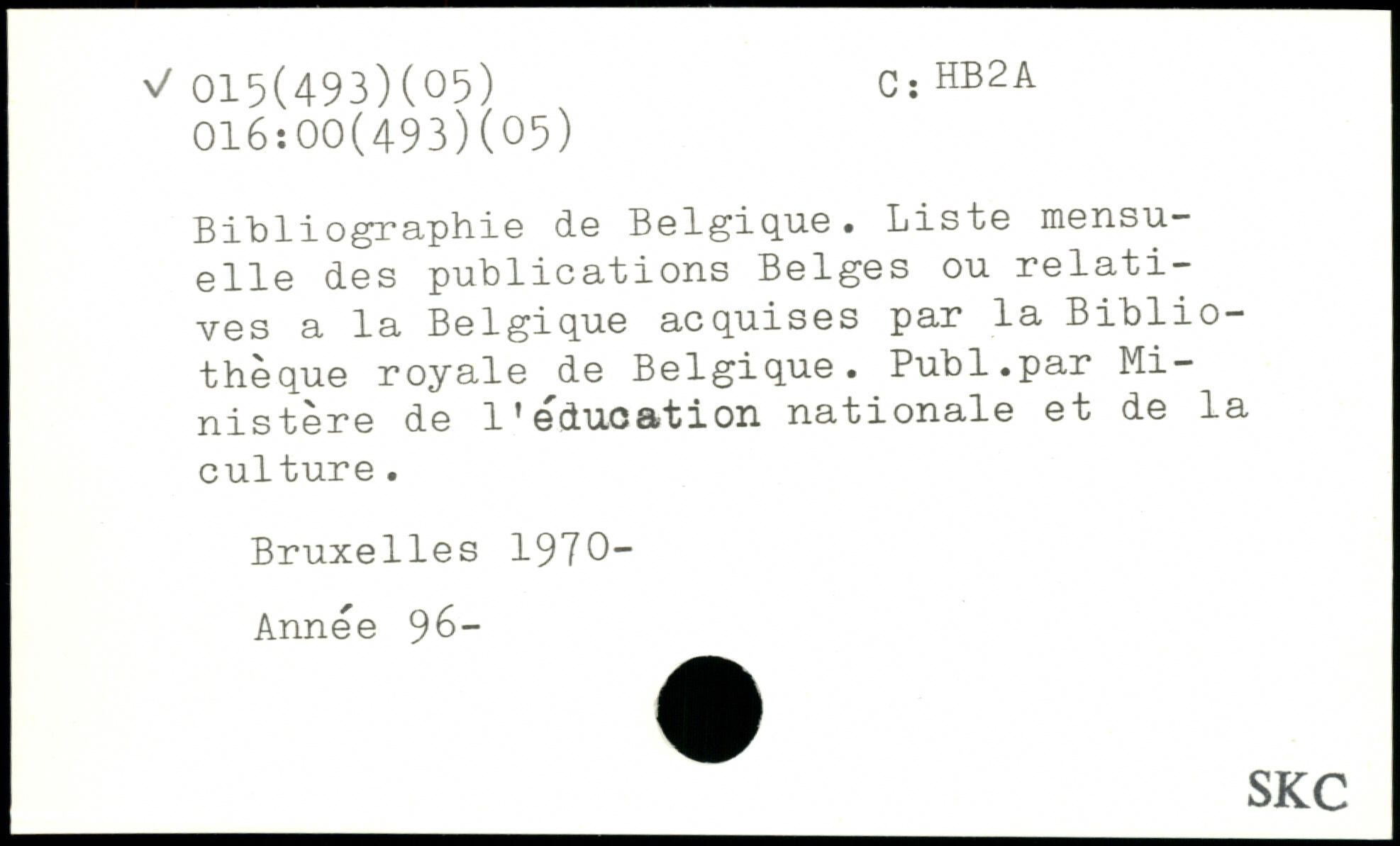 Bibliographie de Belgique. Liste mensuelle des publications Belges ou relatives a la Belgique acquises par la Bibliothèque royale de Belgique. Publ.par Ministère de l’éducation nationale et de la culture.