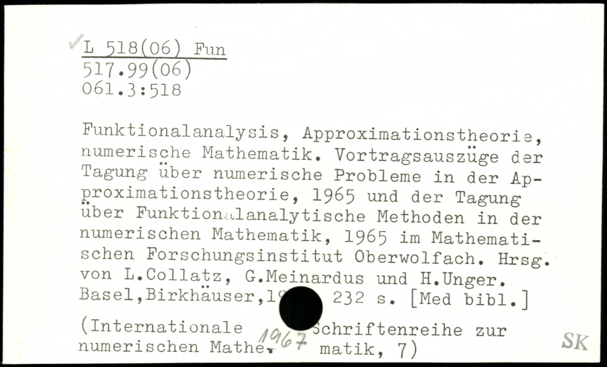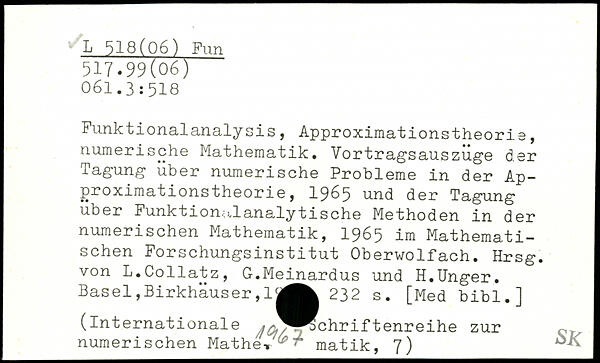 Funktionalanalysis, Approximationstheorie, numerische Mathematik. Vortragsauszuge der Tagung über numerische Probleme in der Approximationstheorie, 1965 und der Tagung über Funktionalanalytische Methoden in der numerischen Mathematik, 1965 im Mathematischen Forschungsinstitut Oberwolfach. Hrsg, von L.Collatz, G.Meijnardus und H.Unger. Basel,Birkhäuser,1|^^