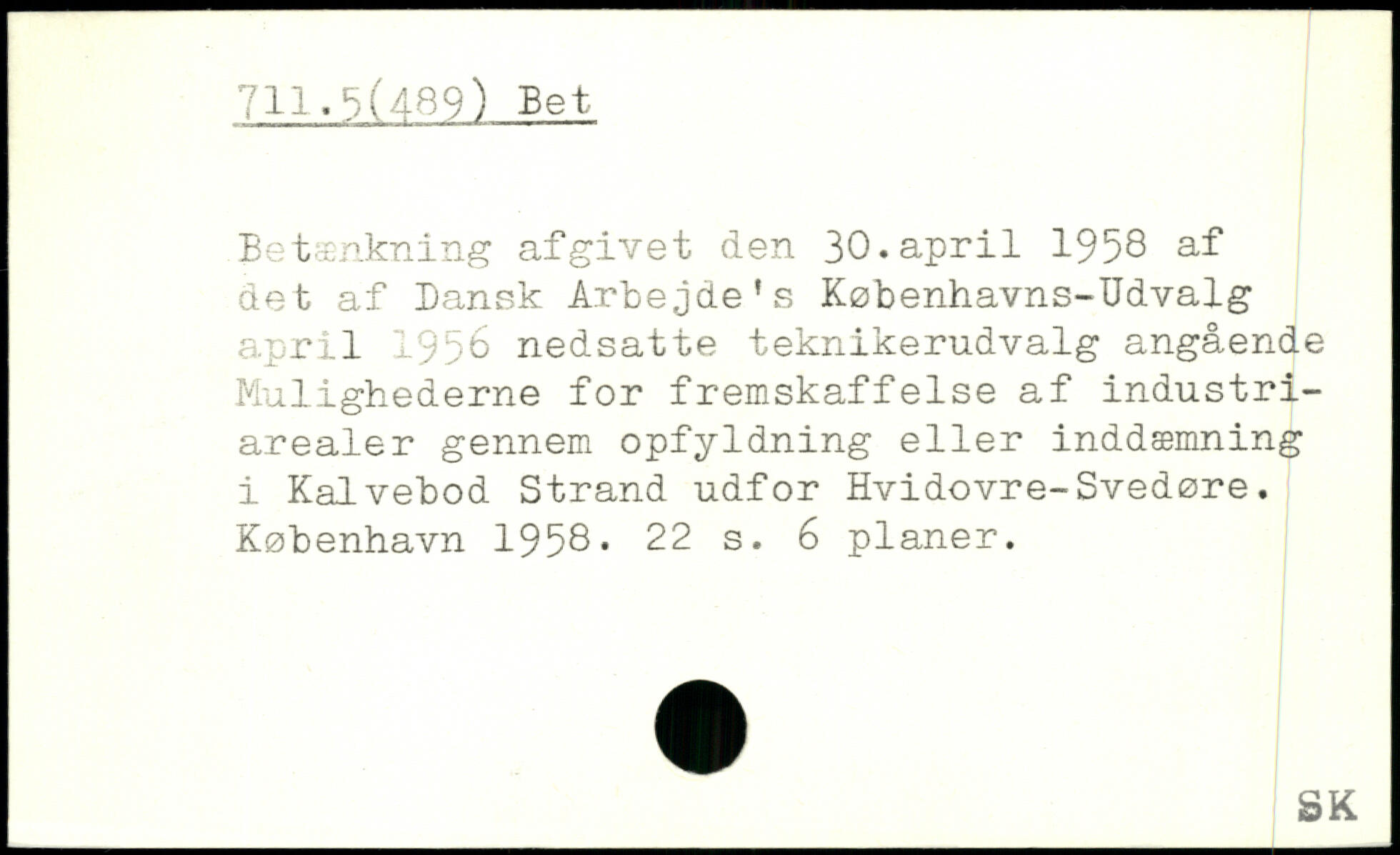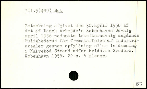 Betænkning afgivet den 30.april 1958 af det af Dansk Arbejde’s Københavns-IJdvalg april 1958 nedsatte teknikerudvalg angående Mulighederne for fremskaffelse af industriarealer gennem opfyldning eller inddæmning i Kalvebod Strand udfor Hvidovre-Svedøre.