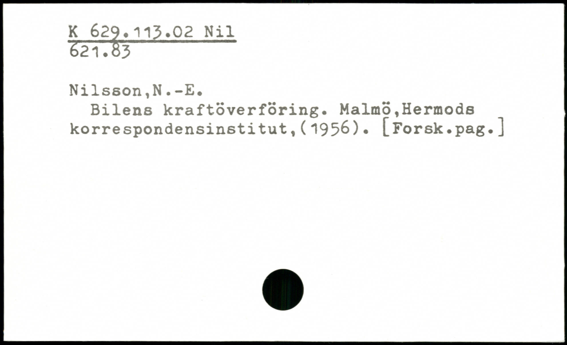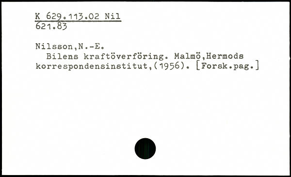 ■&r:tr - Nilsson,N.-E. Bilens kraftöverföring. Malmö,Hermods korrespondensinstitut,(1956).