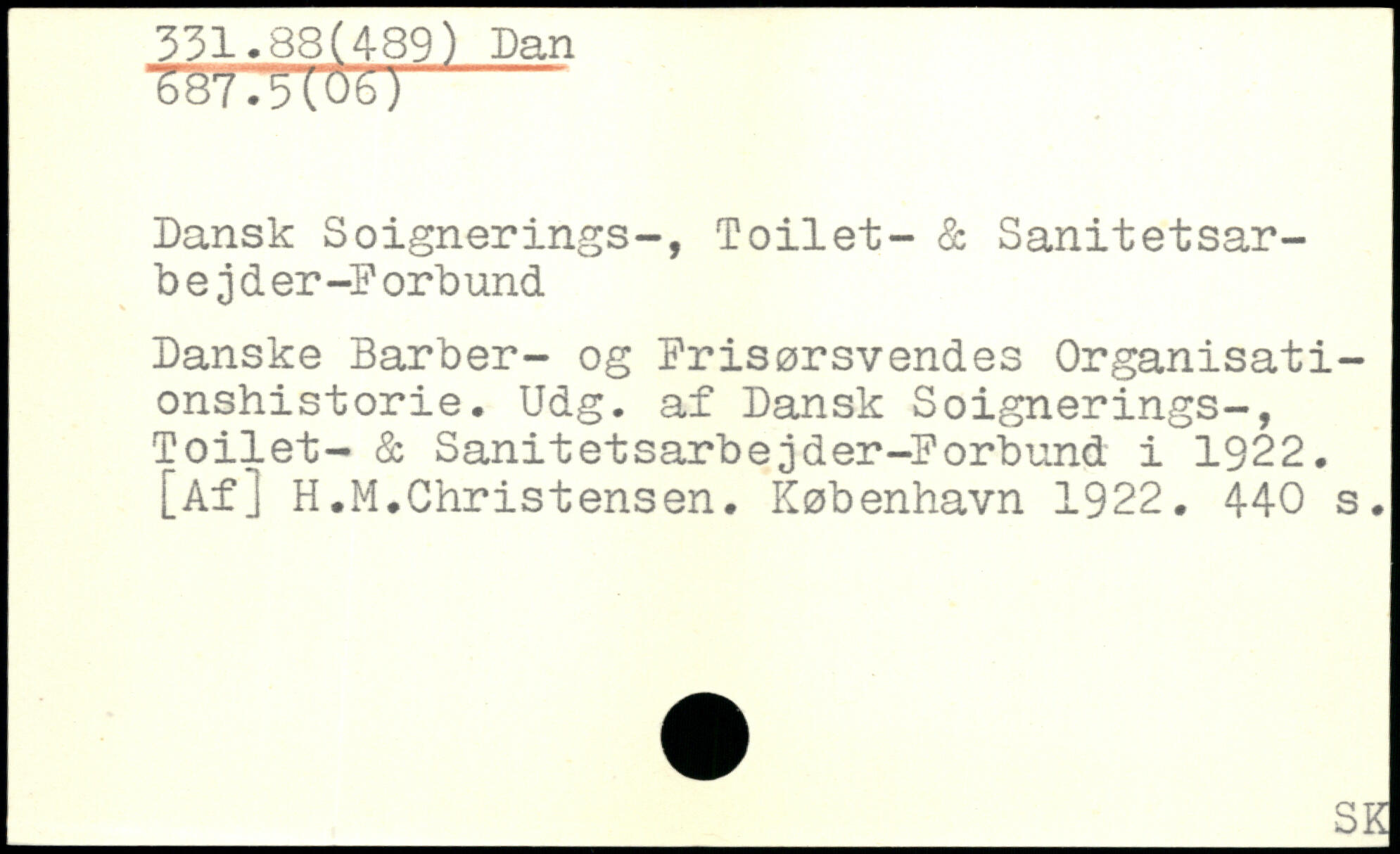 Dansk Soignerings-, Toilet- & Sanitetsarbejd er -F orb und Danske Barber- og Frisørsvendes Organisationshistorie, Udg. af Dansk Soignerings-, Toilet- & Sanitetsarbejder-Forbund i 1922. [Af] H.M.Christensen.