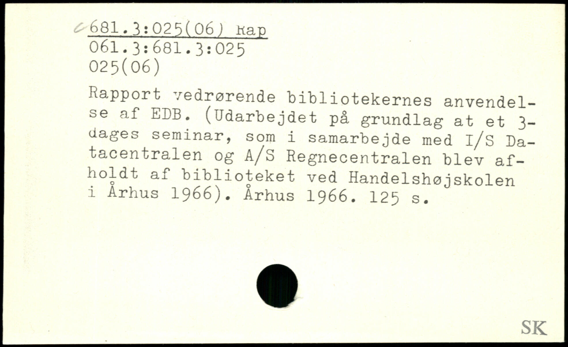 Rapport vedrørende bibliotekernes anvendelse af EDB. (Udarbejdet på grundlag at et 3-dages seminar, som i samarbejde med i/s Datacentralen og å/s Regnecentralen blev afholdt af biblioteket ved Handelshøjskolen i Arhus 1966). Århus 1966.