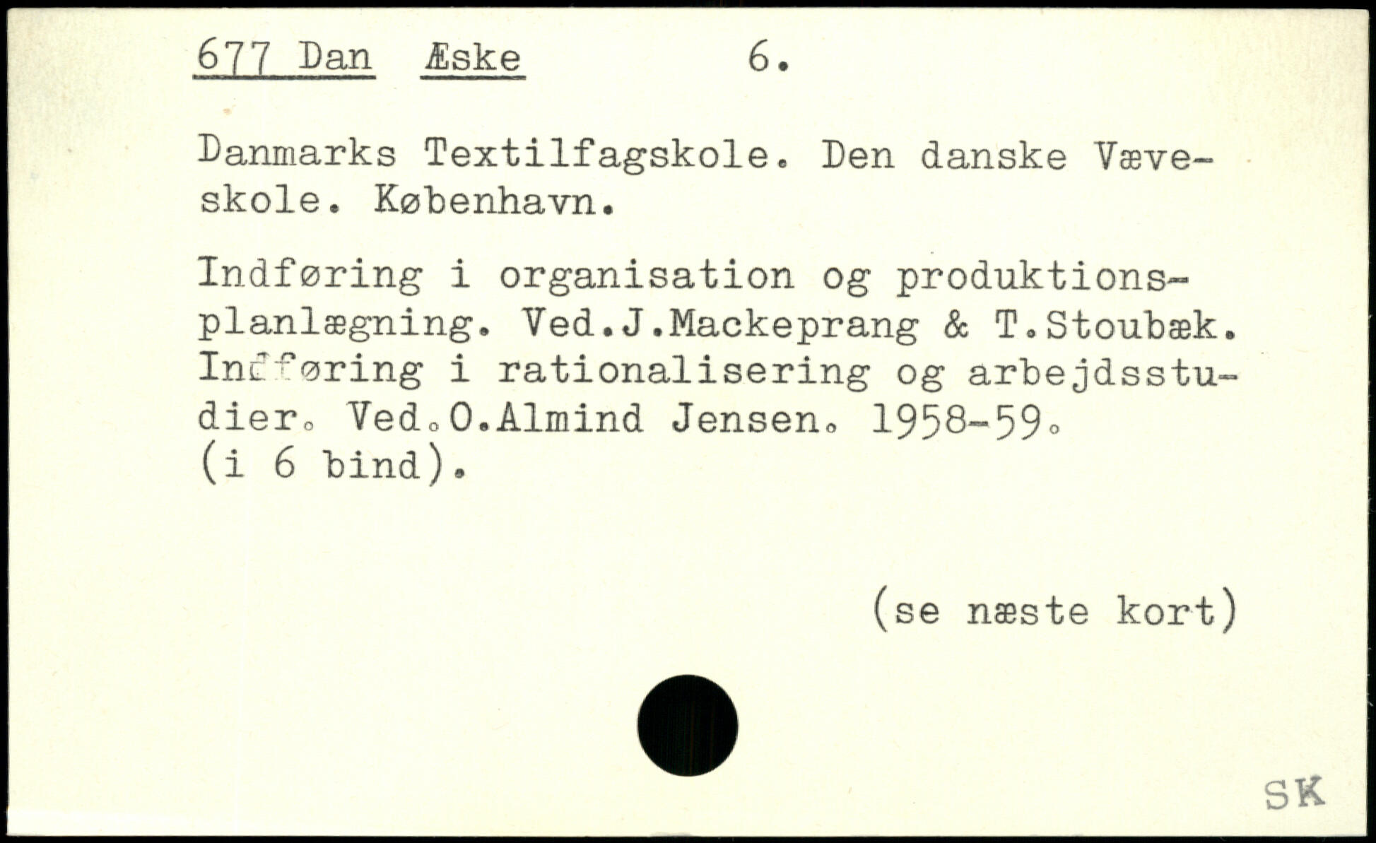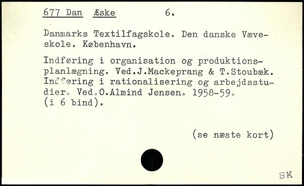 Danmarks Textilfagskole. Den danske Væve-skole. København. Indføring i organisation og produktionsplanlægning. Ved.J.Mackeprang & T.Stoubæk. Indforing i rationalisering og arbejdsstudiero VedoO.Almind Jensen. 1958-59. (i 6 bind). (se næste kort) !