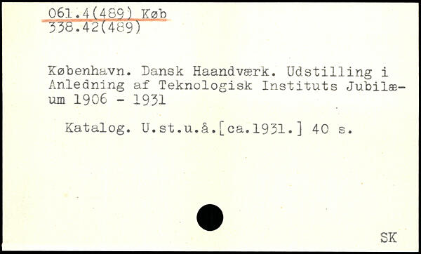 København. Dansk Haandværk. Udst1111ng i Anledning af Teknologisk Instituts Jubilæum 1906 - 1931 Katalog. U.st.u.å.[ca.1931.]