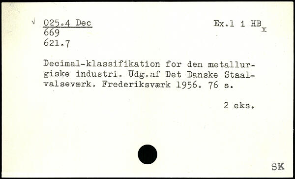 . 02.3.4 De c Ex, 1 i HB 66 9 x 621,7 Decimal-klassifikation for den metallur-giske industri, Udgoaf Det Danske Staal-valseværk, Frederiksværk 1956,